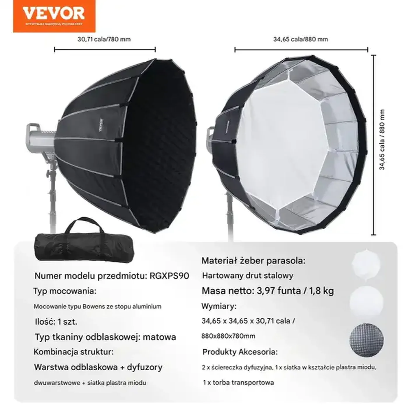 - Szeroki zakres oświetlenia ➡️ duży softbox (880 mm) zapewnia jednolite rozproszenie światła.