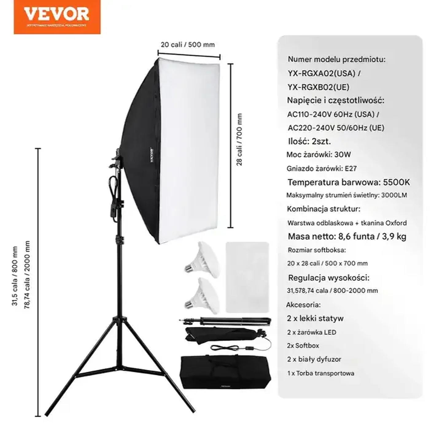 - Miękkie i równomierne światło ➡️ softbox 50×70 cm z diodami LED 30W, 3000LM wysokiej jasności.