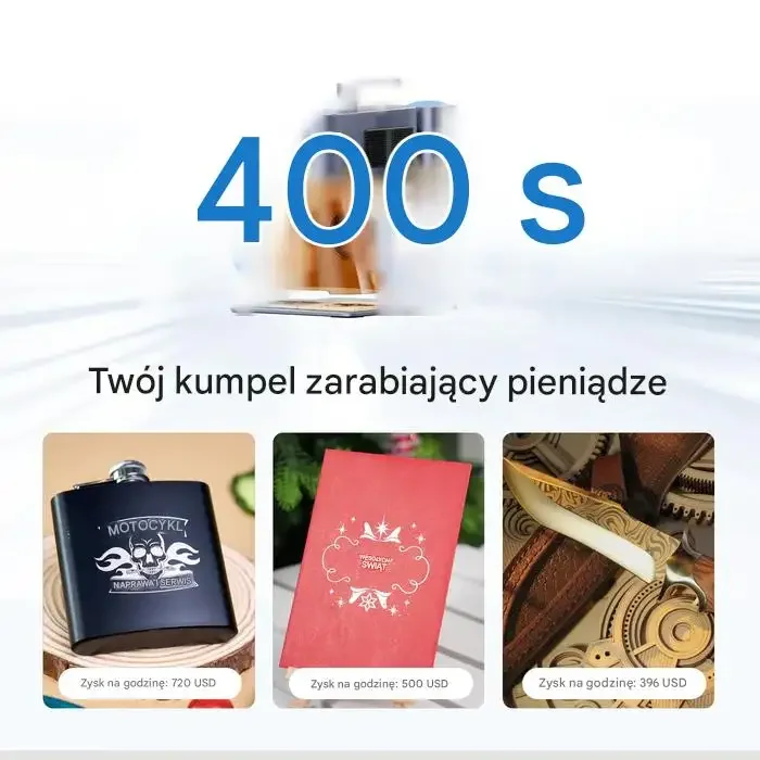 Oferuje możliwość grawerowania z prędkością 4000 mm/s. To idealny partner do zarabiania pieniędzy, z potencjalnym zyskiem wynoszącym do 720 zł za godzinę pracy.