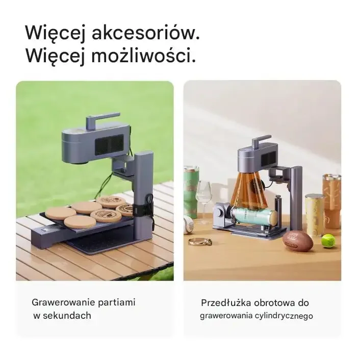 Obszerna gama akcesoriów umożliwia grawerowanie różnych przedmiotów, w tym płaskich i cylindrycznych, co szeroko poszerza możliwości zastosowania.