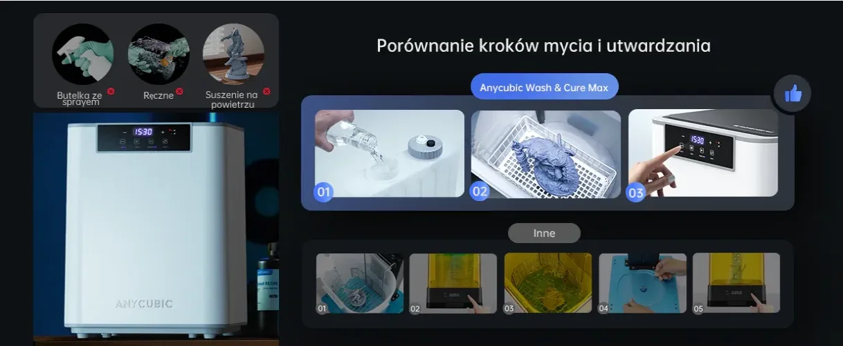 ✅ Trzy tryby pracy – mycie, utwardzanie oraz FlexiCure z regulacją czasu 1-30 minut dla pełnej kontroli procesu
