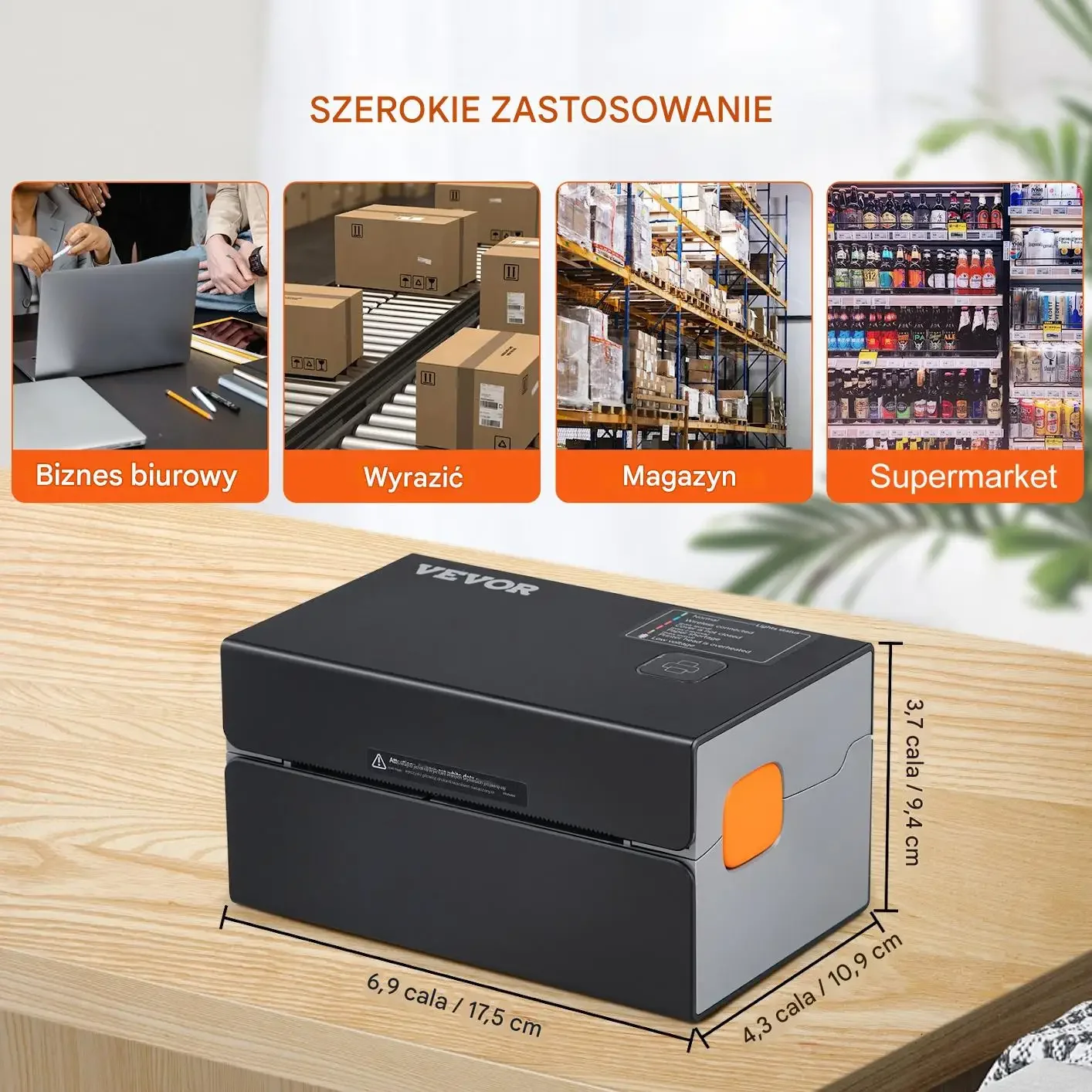 Szerokie zastosowanie: biuro, wysyłka na taśmie/liniach pakowania, magazyn, supermarket. Urządzenie nadaje się do generowania etykiet produktowych i wysyłkowych w środowiskach handlowych i logistycznych.