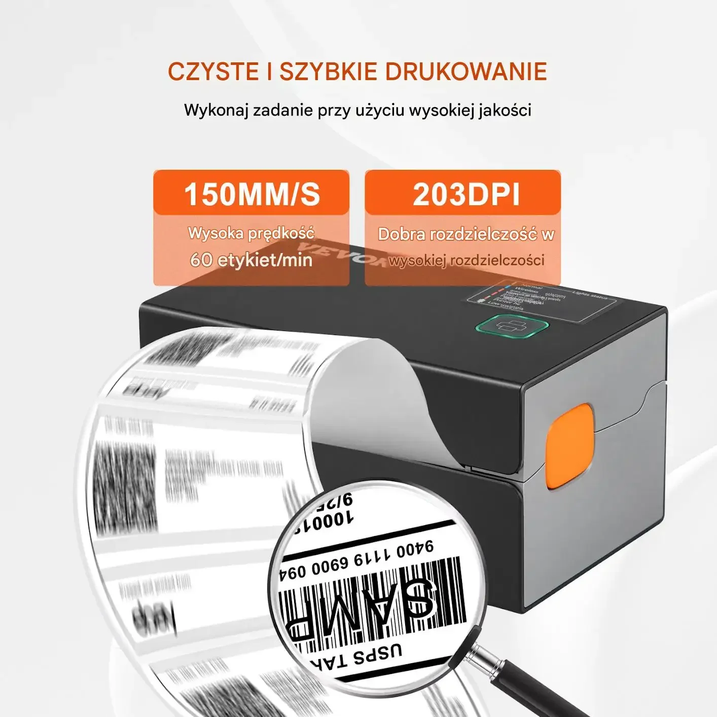 Wymiary drukarki: długość 17,5 cm, szerokość 10,9 cm, wysokość 9,4 cm. Czyste i szybkie drukowanie: prędkość do 150 mm/s (około 60 etykiet/min). Rozdzielczość druku: 203 DPI. Obsługa etykiet termicznych o szerokości od 1,57″ do 4,25″ (odpowiednio przeliczono tylko tam, gdzie podano obie jednostki; w opisie użyto jednostek metrycznych zgodnie z grafiką).