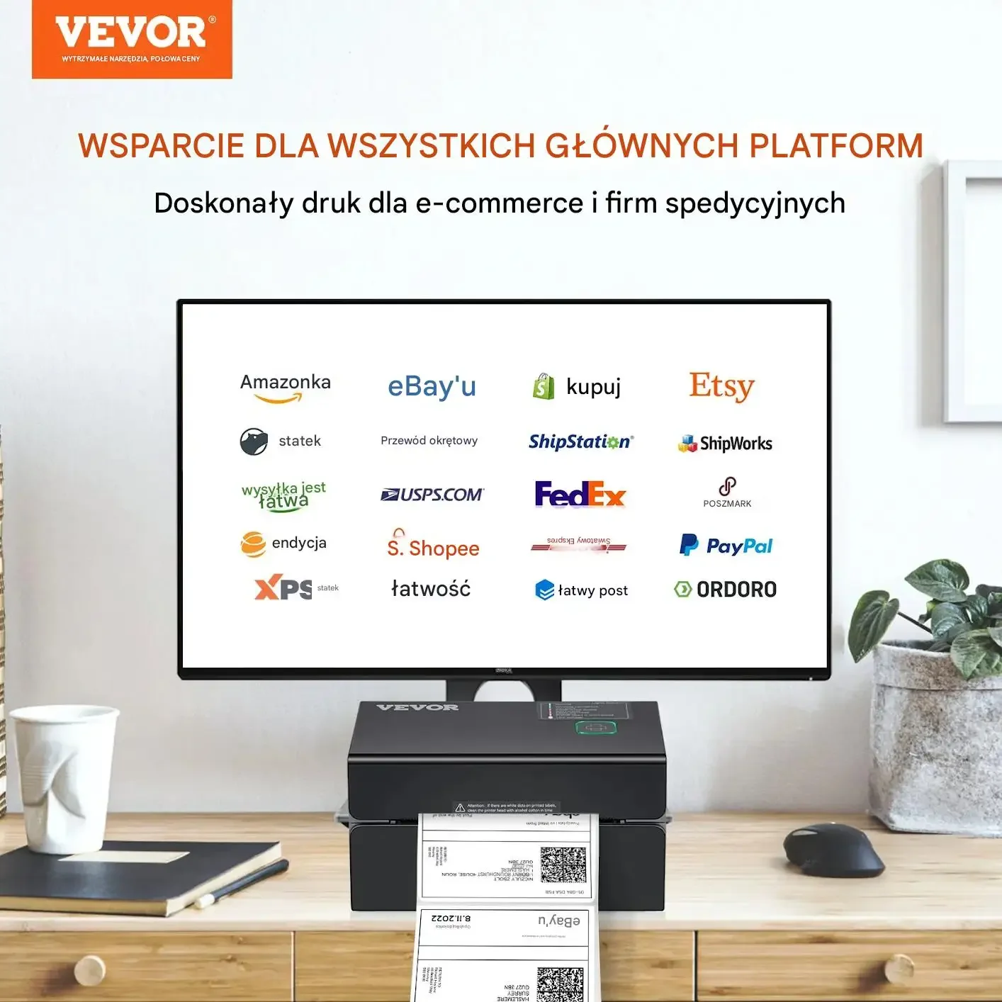 Wsparcie dla wszystkich głównych platform. Doskonały druk dla e-commerce i firm spedycyjnych. Obsługa wielu serwisów i integracji kurierskich (przykłady widoczne na grafice: Amazon, eBay, Etsy, FedEx, USPS, PayPal, ShipStation, ShipWorks i inne), co ułatwia druk etykiet wysyłkowych i logistykę.