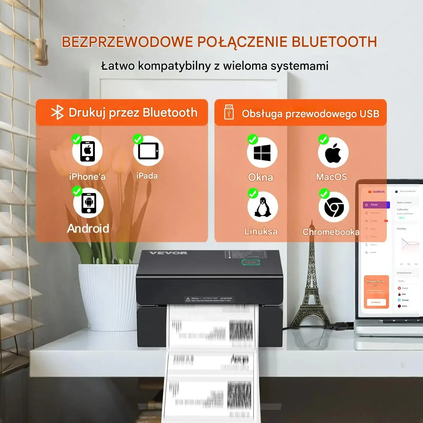 - ⭕Bezprzewodowe połączenie Bluetooth – możliwość drukowania bez kabli.