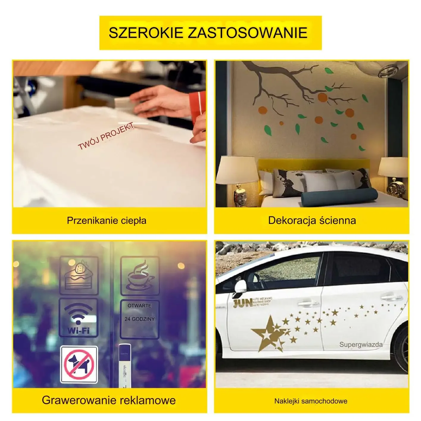 Urządzenie dedykowane jest do różnorodnych zastosowań: przenikanie ciepła (transfer), dekoracje ścienne, grawerowanie reklamowe, naklejki samochodowe oraz projekty „Twój projekt” z możliwością oznaczania godzin pracy i dostępu do sieci Wi‑Fi.