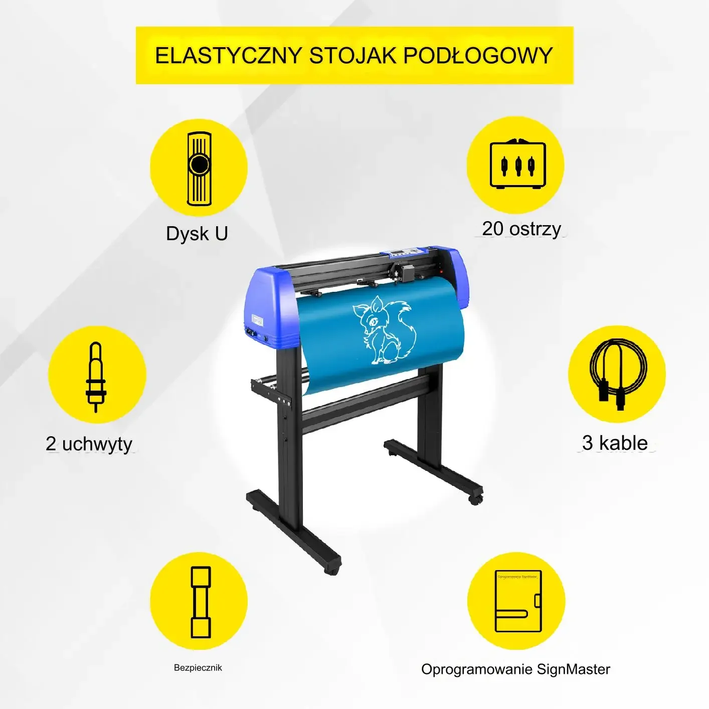 Elastyczny stojak podłogowy zapewnia stabilność podczas pracy; w zestawie znajdują się 2 uchwyty i 3 kable, a także bezpiecznik i oprogramowanie SignMaster. Wyposażenie obejmuje również dysk U i opisane elementy konstrukcji.