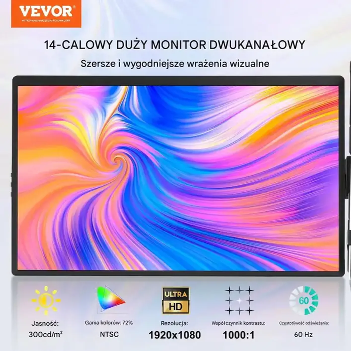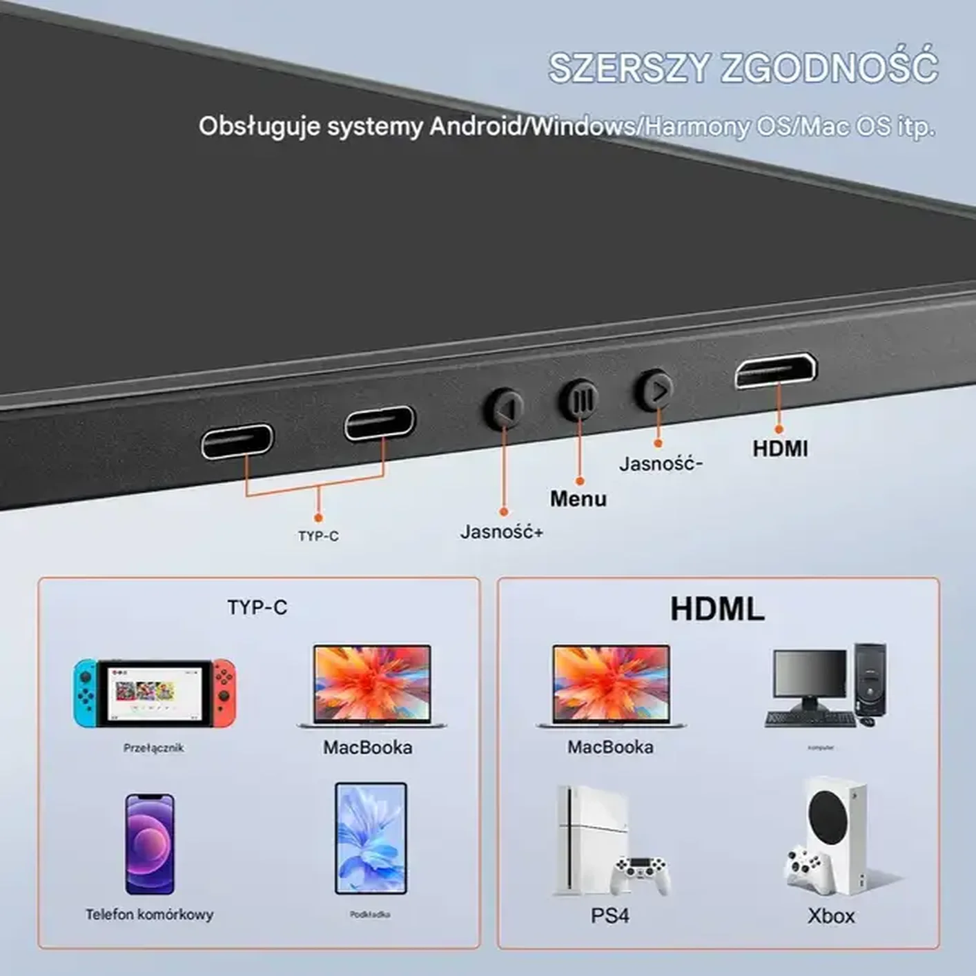 - ✅ Kompatybilność: Działa z laptopami 13–17″, Android, Windows, Harmony OS, Mac OS, a także konsolami: Switch, PS4, Xbox.