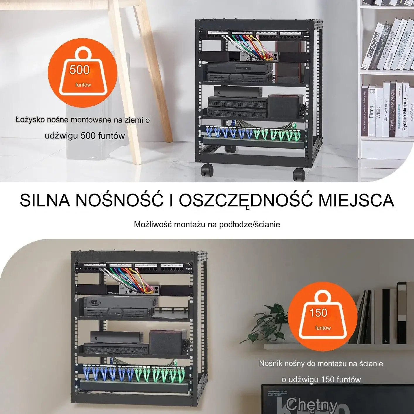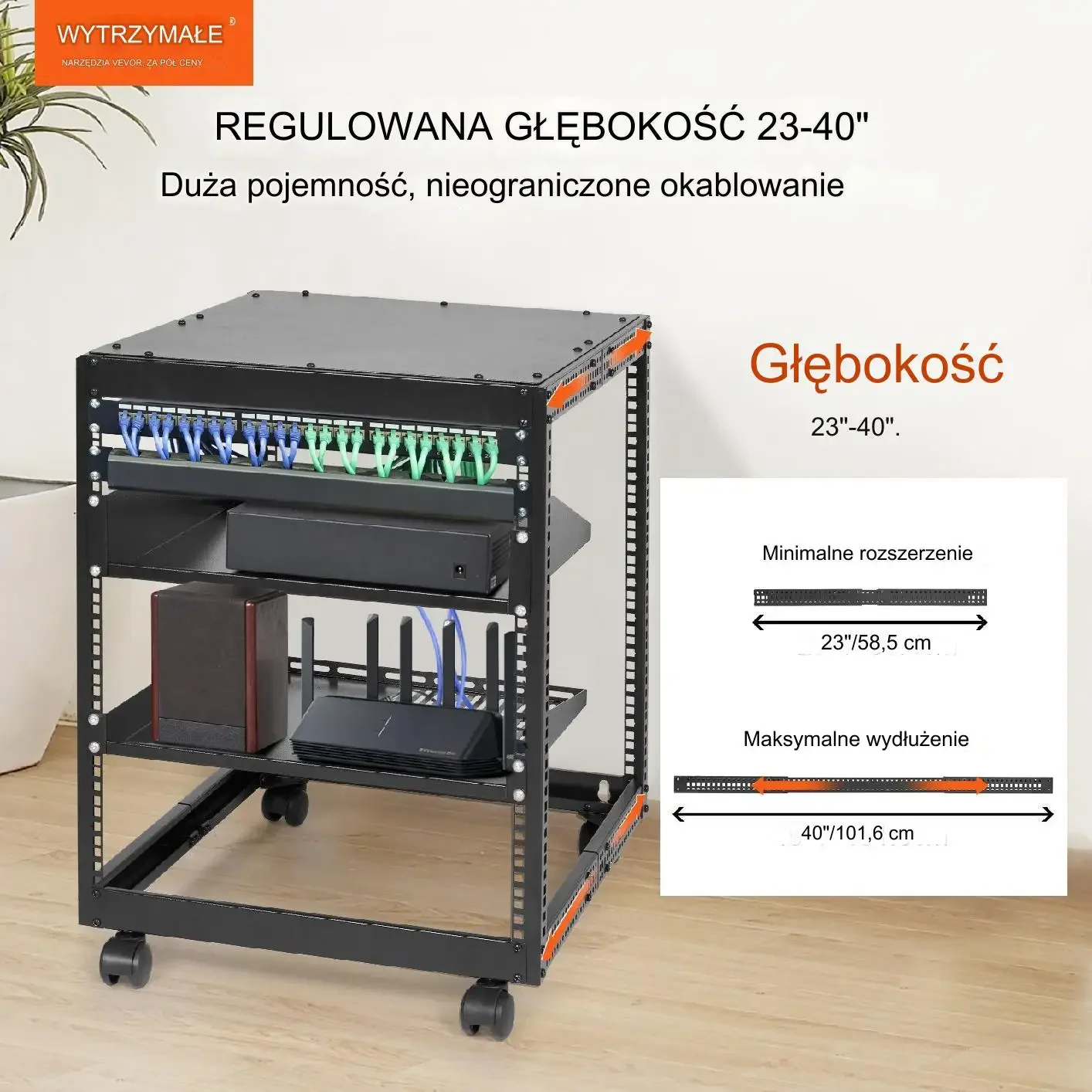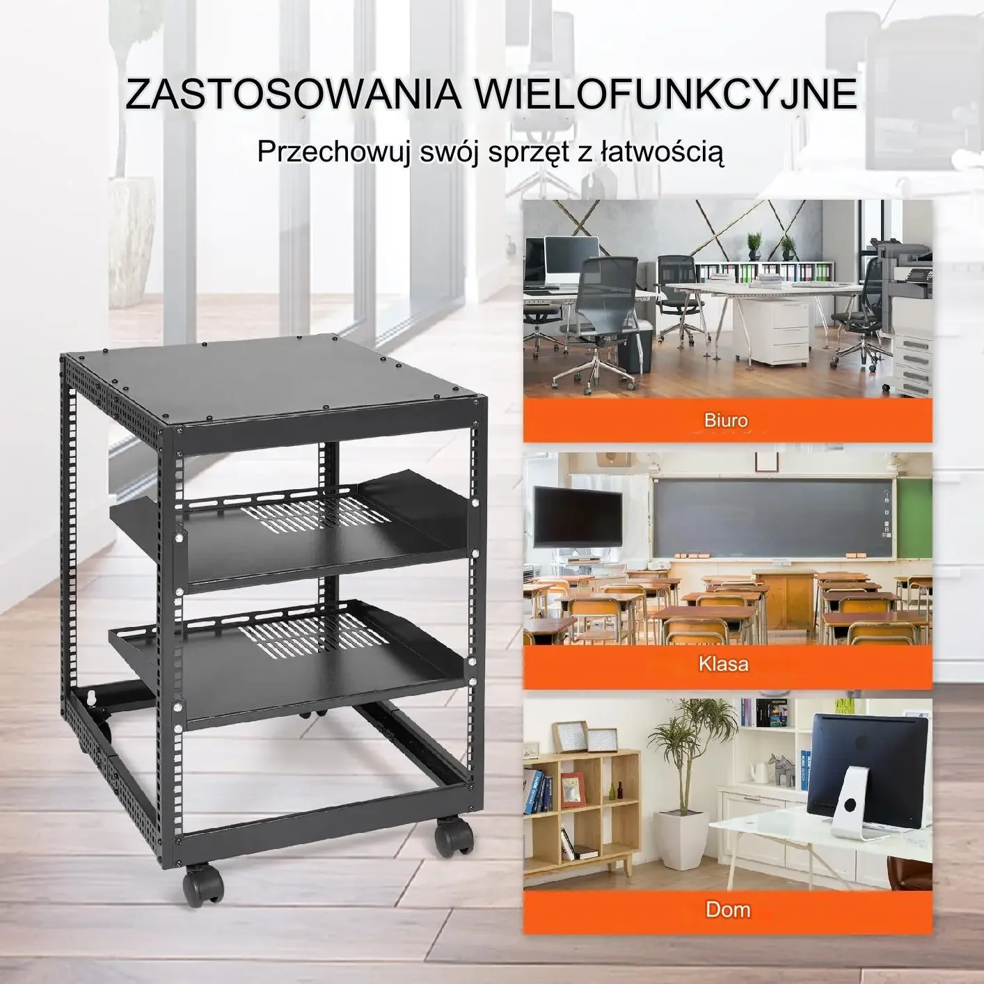 Przestronny regał sieciowy na sprzęt IT, dedykowany do domu, biura i klasy. Udźwig 500 funtów, co odpowiada około 226,8 kg. W zestawie możliwość montażu na podłodze lub ścianie, z łatwym przemieszczaniem dzięki kółkom. Opcja konfiguracji górnego panelu dla dodatkowego miejsca i udostępniania przechowywanych urządzeń.