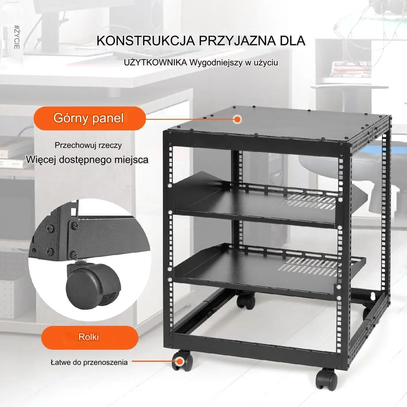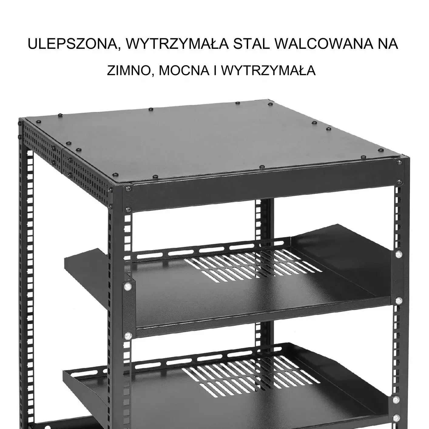 Ścianki z otworami montażowymi typu rack umożliwiają łatwe dopasowanie ustawień i pozycji półek. Nóżki wspornikowe i system kołowy zapewniają łatwe przemieszczanie oraz stabilność na różnych powierzchniach. Górny panel oraz liczne półki pozwalają na organizację urządzeń, kabli i akcesoriów zgodnie z potrzebami użytkownika.