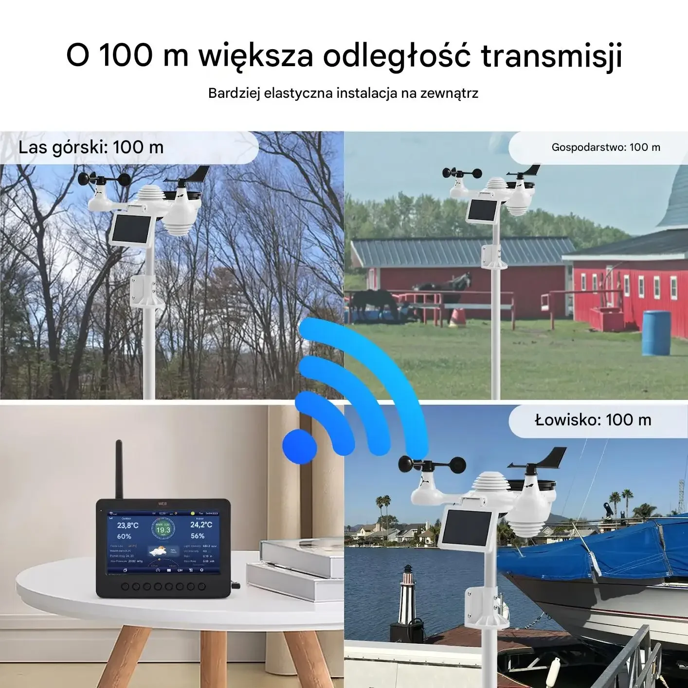 • Zasięg transmisji 100 metrów: Bardzo duży zasięg transmisji bezprzewodowej umożliwia elastyczne rozmieszczenie czujników. Idealna do kominów, dachów, ogrodów i gospodarstw rolnych.