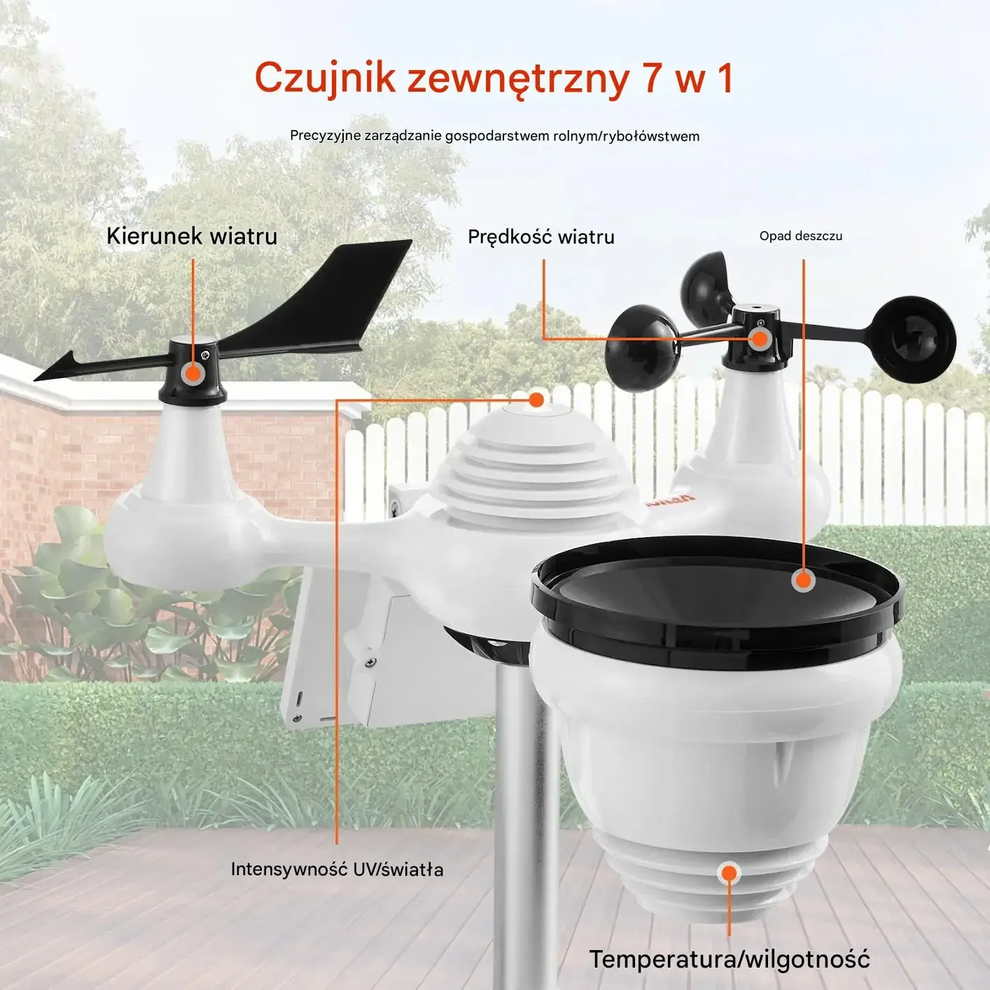 • Sensor 7 w 1: Precyzyjny monitoring prędkości i kierunku wiatru, temperatury, wilgotności, opadów, natężenia światła. Dodatkowo wyświetla odczuwalną temperaturę wiatru, punkt rosy, ciśnienie, kalendarz i fazy księżyca.