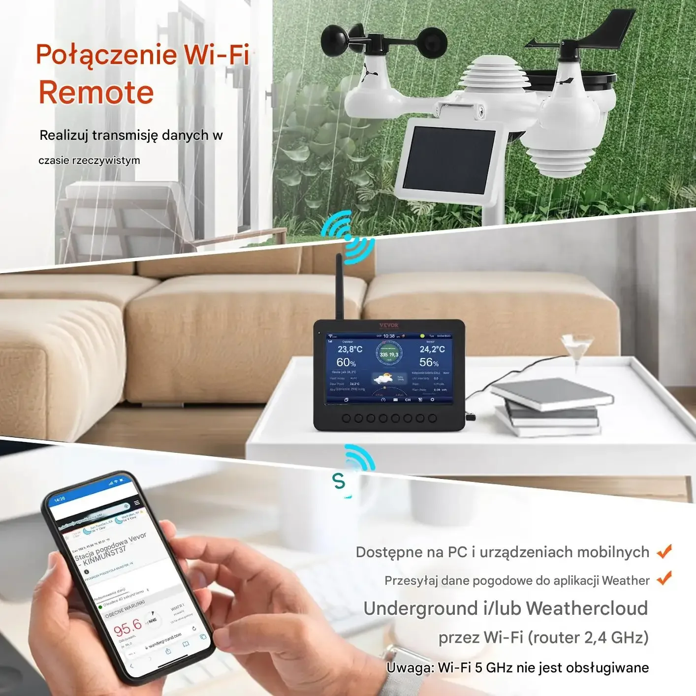 • Zdalne sterowanie Wi-Fi: Transfer danych w czasie rzeczywistym, obsługa połączeń z Weather Underground & WeatherCloud. Możliwość podglądu, zapisywania, analizowania i udostępniania danych na smartfonie.