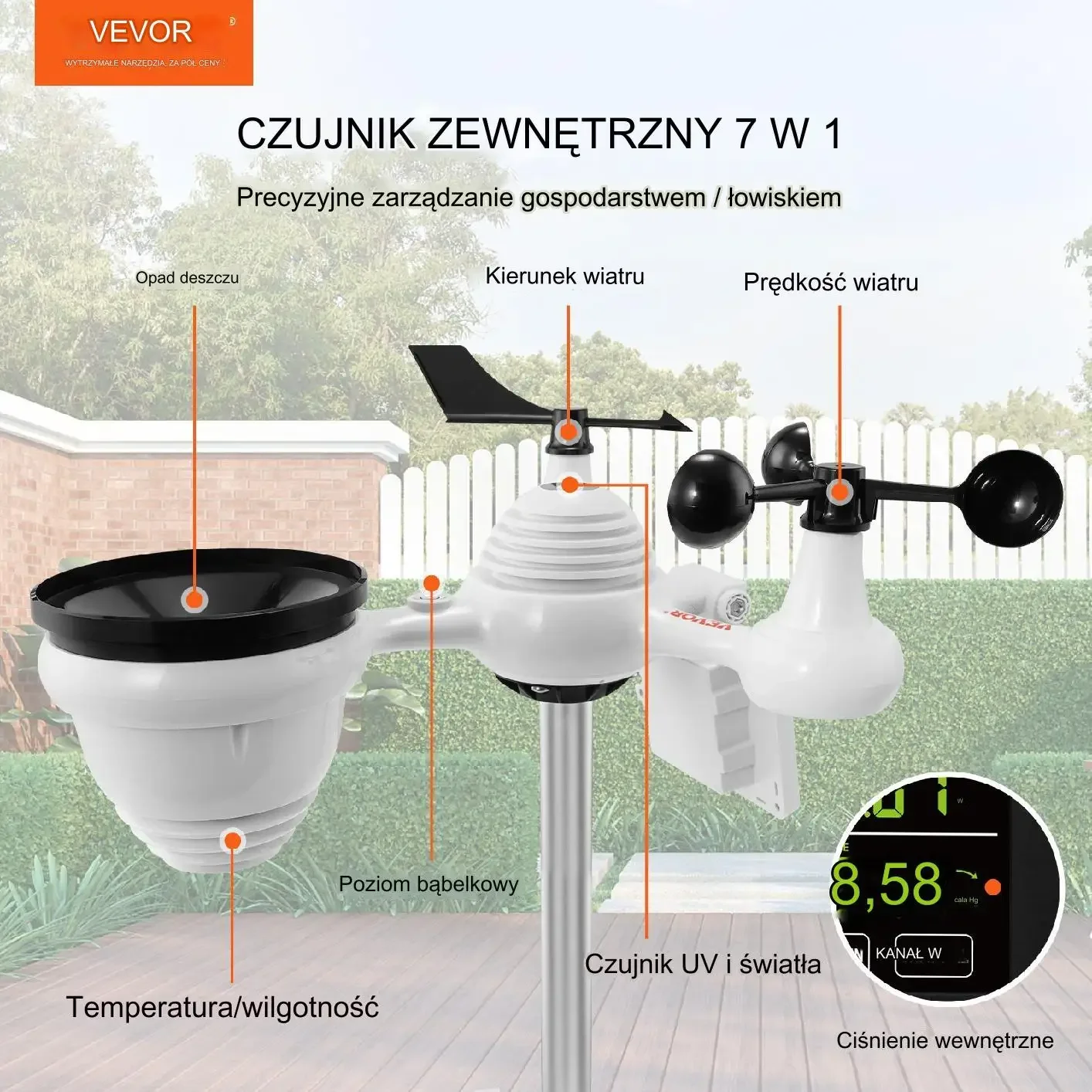 - ❇️Czujnik 7 w 1: Monitoruje prędkość wiatru, temperaturę, wilgotność, promieniowanie i inne parametry.
