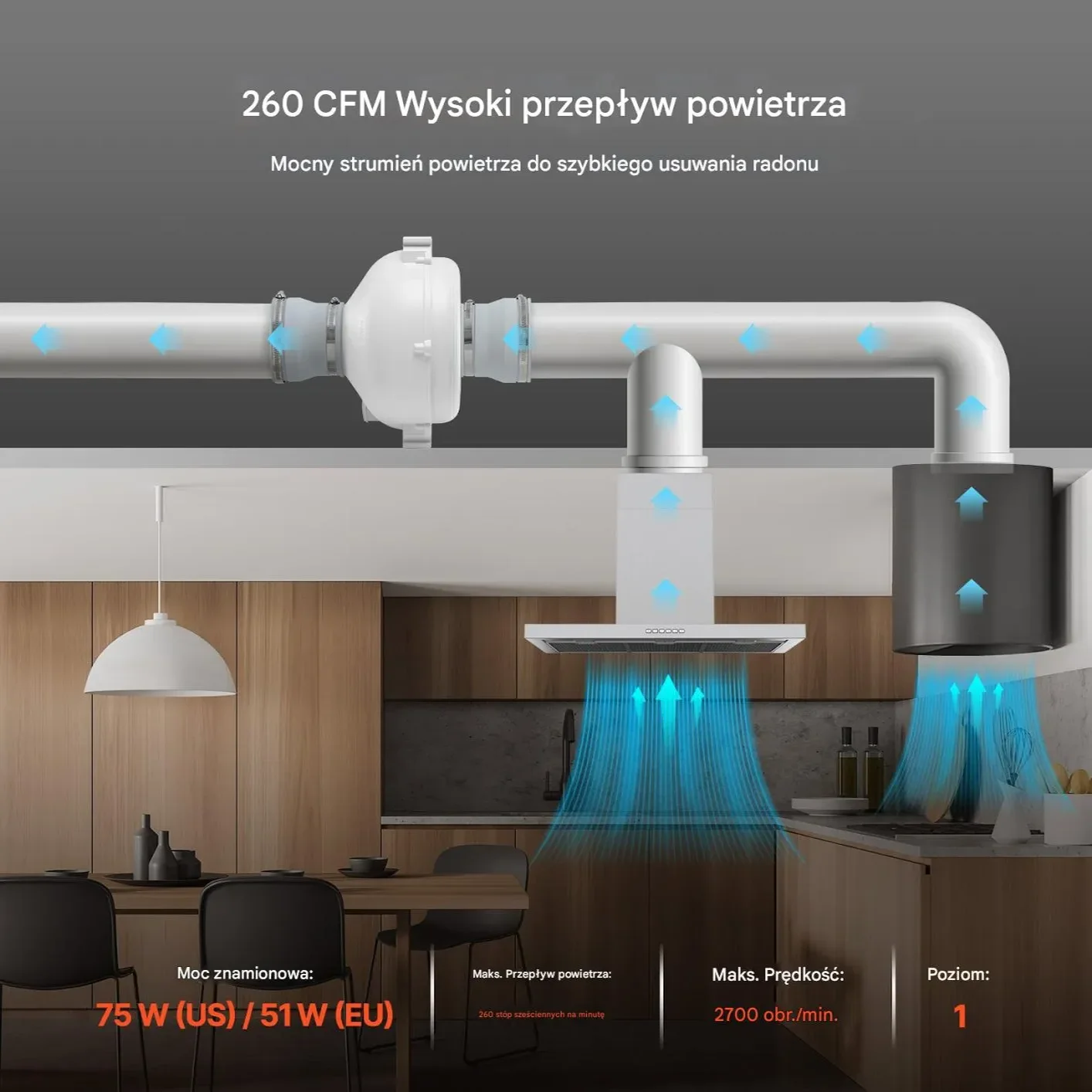 Dzięki mocnemu przepływowi powietrza wynoszącemu 441 m³/h oraz wysokiej prędkości działania, ten wentylator skutecznie i szybko usuwa radon z wnętrza budynków. Niezależnie od tego, czy jest zamontowany w piwnicy, czy na poddaszu, zapewnia zdrowe warunki w Twoim domu.