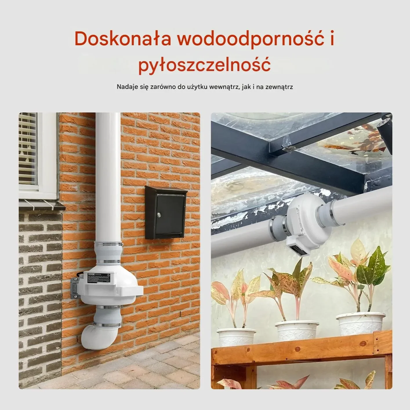 Dzięki doskonałym właściwościom wodoodpornym i pyłoszczelnym, ten wentylator kanałowy wytrzymuje trudne warunki pogodowe, nawet jeśli jest zamontowany na zewnątrz. Bez względu na to, czy znajduje się w piwnicy, na poddaszu, czy w zewnętrznym kanale wentylacyjnym, możesz używać go z pełnym zaufaniem.