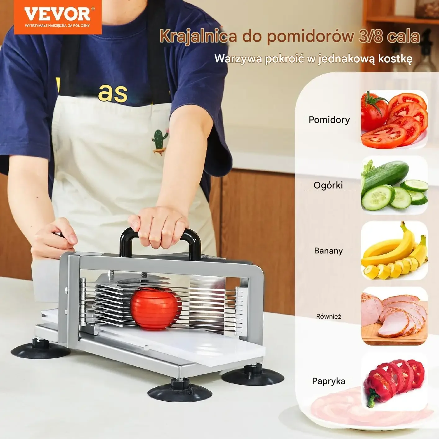 - ✅ Bezproblemowe krojenie składników – idealna do pomidorów, ogórków, bananów, szynki, papryki i wielu innych warzyw oraz owoców