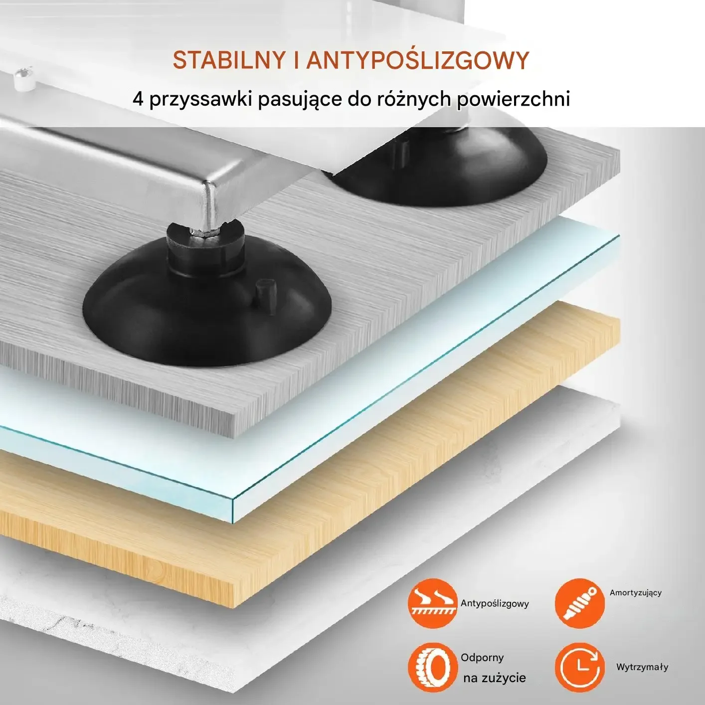 Stabilny i antypoślizgowy. Wyposażony w 4 przysawki, które pasują do różnych powierzchni.