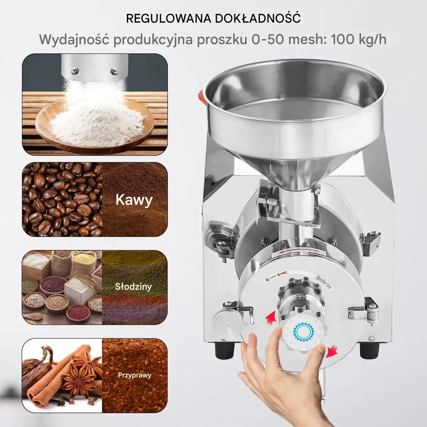 Wydajny młynek przemysłowy do zbóż, nasion, przypraw i materiałów włóknistych. Mocny silnik 3000 W, stal nierdzewna oraz regulacja grubości mielenia zapewniają szybkie i precyzyjne mielenie w domowych i profesjonalnych zastosowaniach.