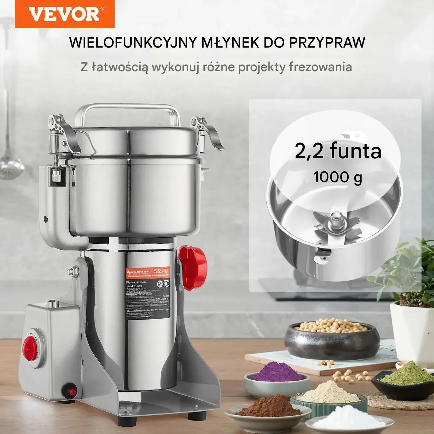 Wysokowydajny młynek swingowy do przypraw, ziaren i suszonych produktów spożywczych. Mocny silnik 3000 W, stal nierdzewna 403 i regulacja grubości mielenia zapewniają szybkie, precyzyjne i bezpieczne mielenie w domu i w kuchniach profesjonalnych.