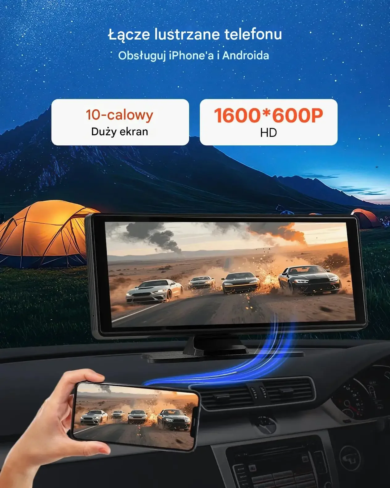 Duży, 10-calowy ekran o wysokiej rozdzielczości 1600 x 600P HD zapewnia krystalicznie czysty i szczegółowy obraz w każdych warunkach. Dodatkowo urządzenie obsługuje funkcję łącza lustrzanego (Screen Mirroring), co pozwala na płynne i bezpośrednie przesyłanie obrazu z ekranów smartfonów z systemami operacyjnymi iOS (iPhone) oraz Android.