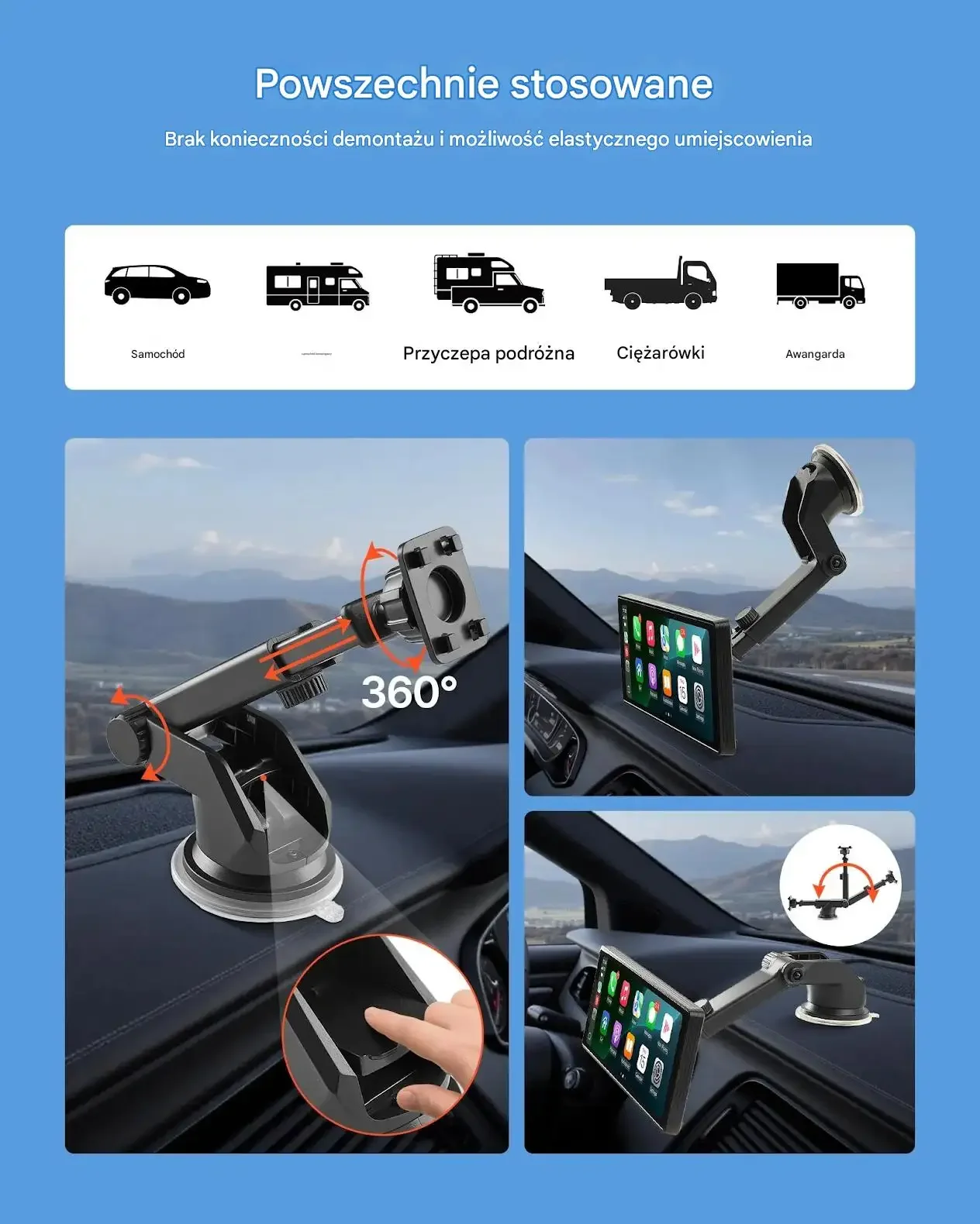 Dzięki elastycznym opcjom umiejscowienia i brakowi konieczności skomplikowanego demontażu kokpitu, urządzenie jest powszechnie stosowane w różnych pojazdach, takich jak samochody osobowe, ciężarówki, vany czy przyczepy podróżne. Regulowany w zakresie 360 stopni uchwyt z mocną przyssawką pozwala na bezpieczny i stabilny montaż na desce rozdzielczej lub przedniej szybie, zapewniając optymalny kąt widzenia.