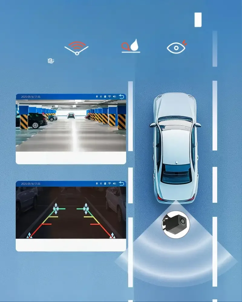 - ✅ Kamera cofania z asystentem parkowania: Wodoodporna kamera tylna aktywuje się automatycznie po wrzuceniu biegu wstecznego, oferując regulowane linie pomocnicze.