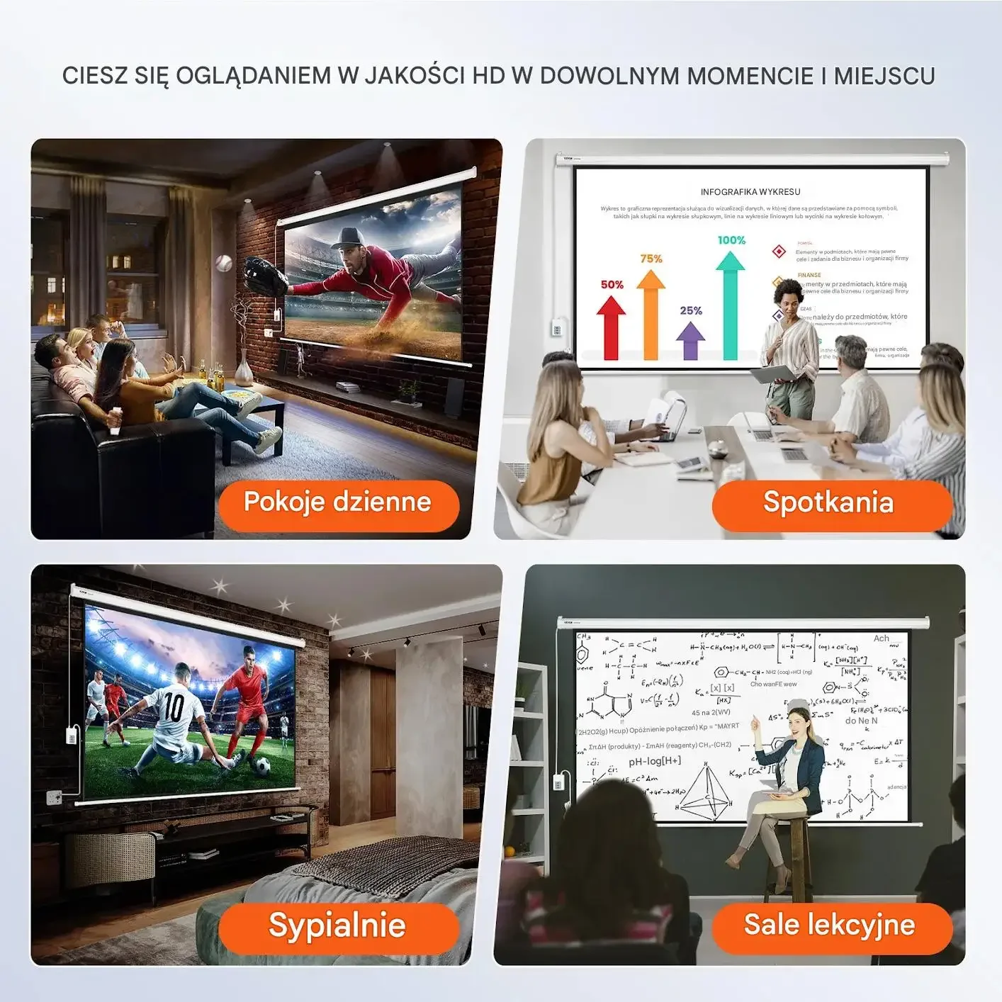 - ✅ Duży format projekcji: Przekątna 100 cali w proporcji 16:9 gwarantuje kinowe wrażenia