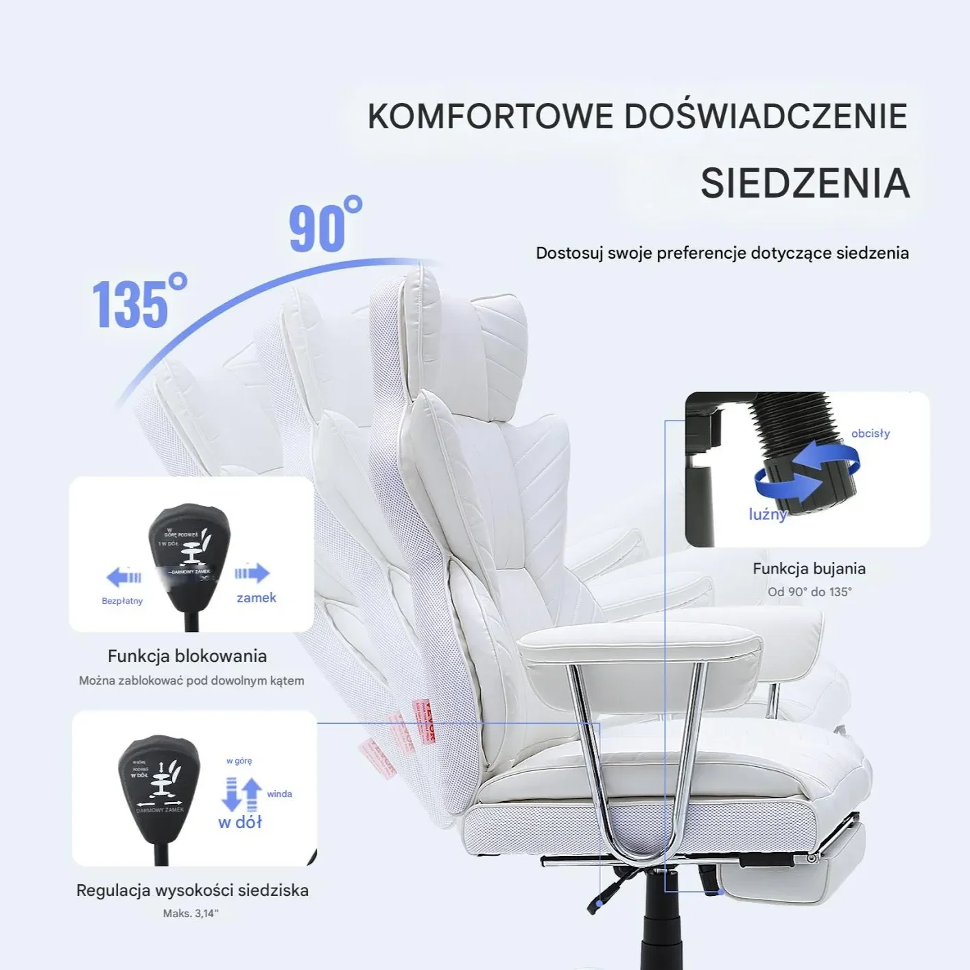 Fotel biurowy z podnóżkiem – ergonomiczny z podparciem lędźwiowym biały