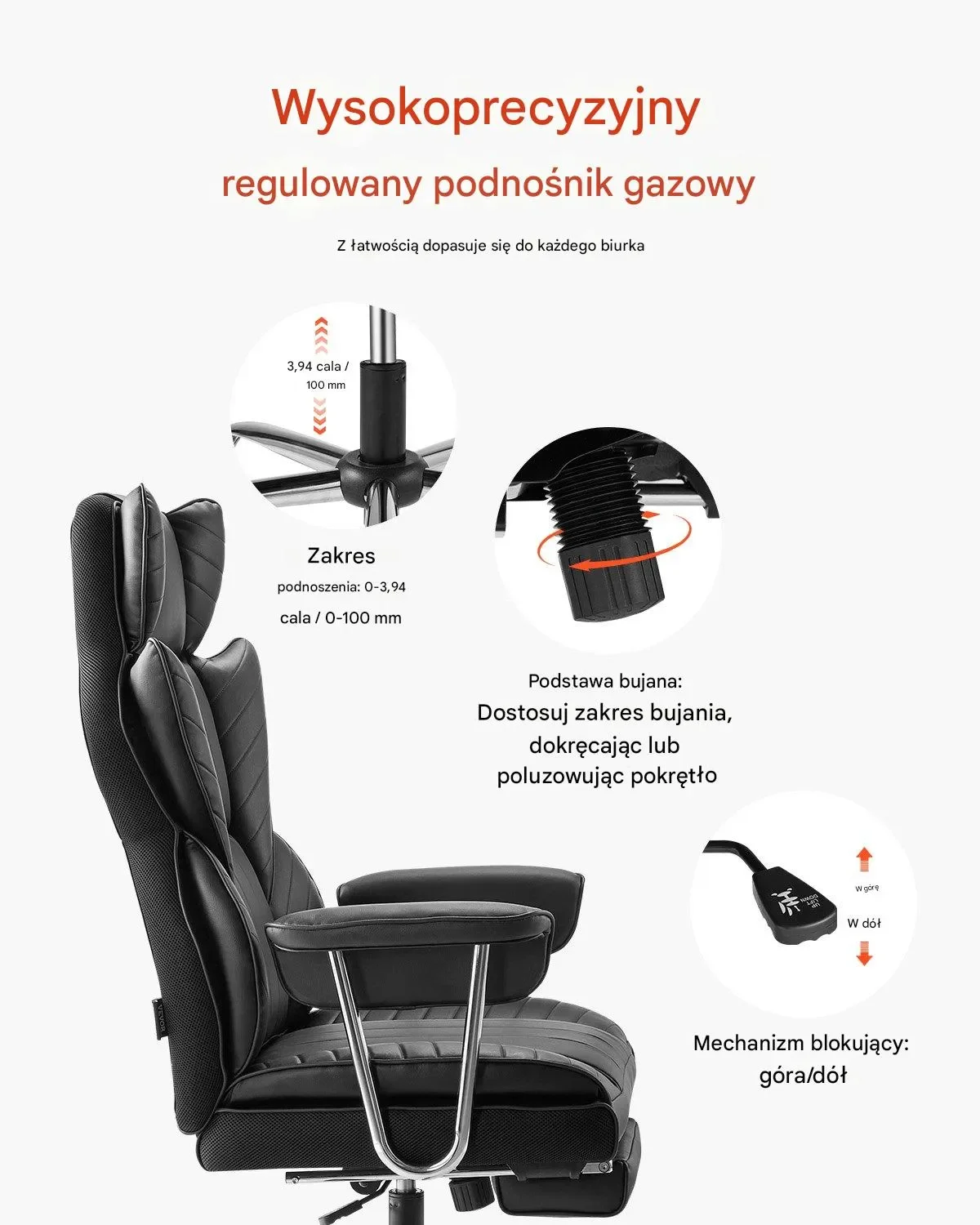 Fotel managerski biurowy czarny z podnóżkiem – regulowane podłokietniki