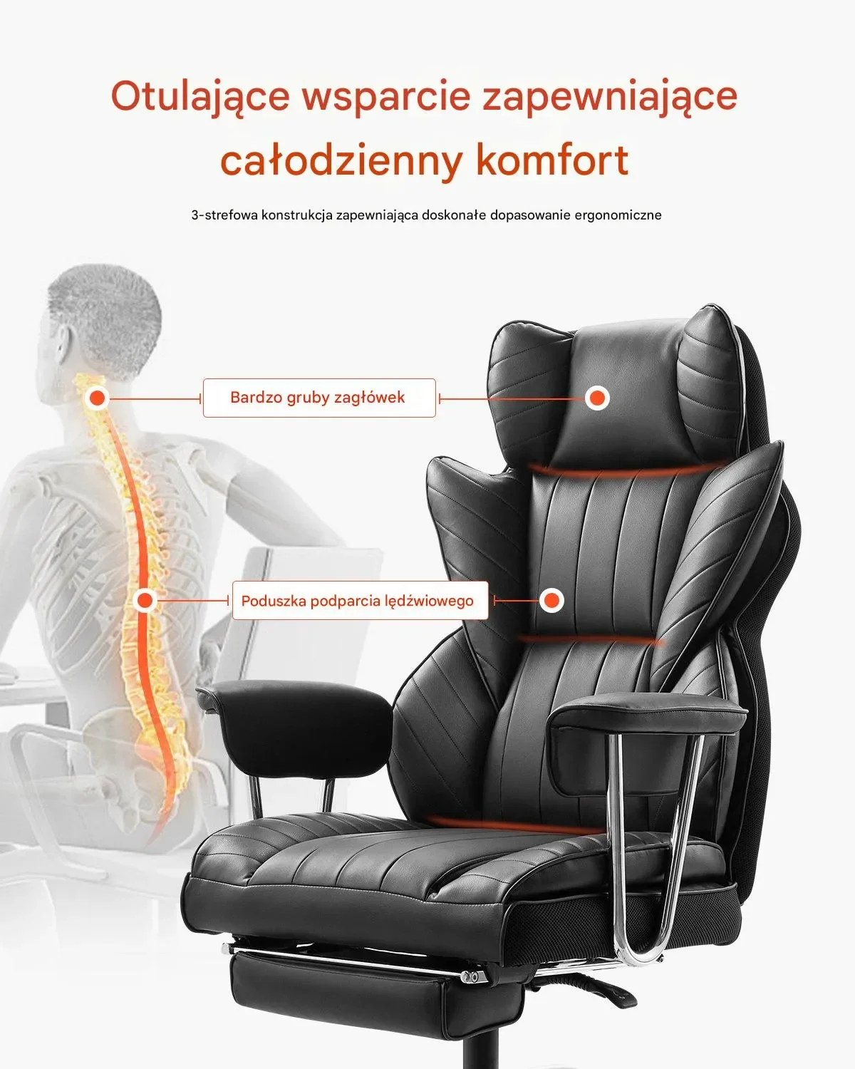 • Redukcja bólu pleców – ergonomiczne podparcie lędźwiowe zmniejsza napięcie mięśni