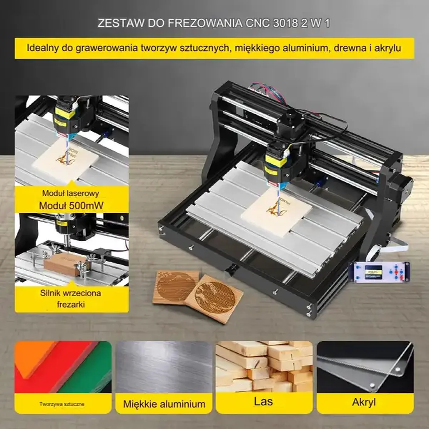 • Podwójna funkcjonalność: Oferuje zarówno frezowanie CNC, jak i grawerowanie laserowe (500mW), co zwiększa wszechstronność zastosowań.
