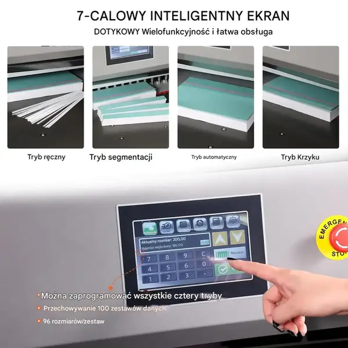 • Dotykowy ekran: 7-calowy panel z czterema trybami cięcia, możliwością zapisania do 100 zestawów po 96 rozmiarów, ustawieniami systemu i diagnostyką