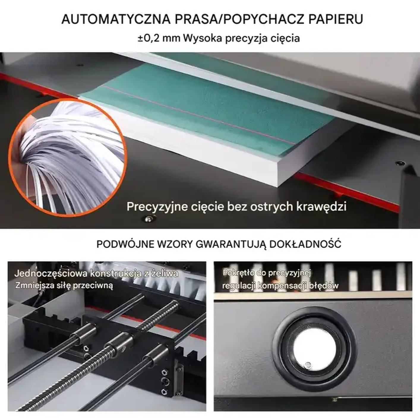 • Wysoka precyzja: Dokładność cięcia ±0,2 mm dzięki odlewowi żeliwnemu, czujnikom podczerwieni, automatycznemu dociskowi i podawaniu papieru