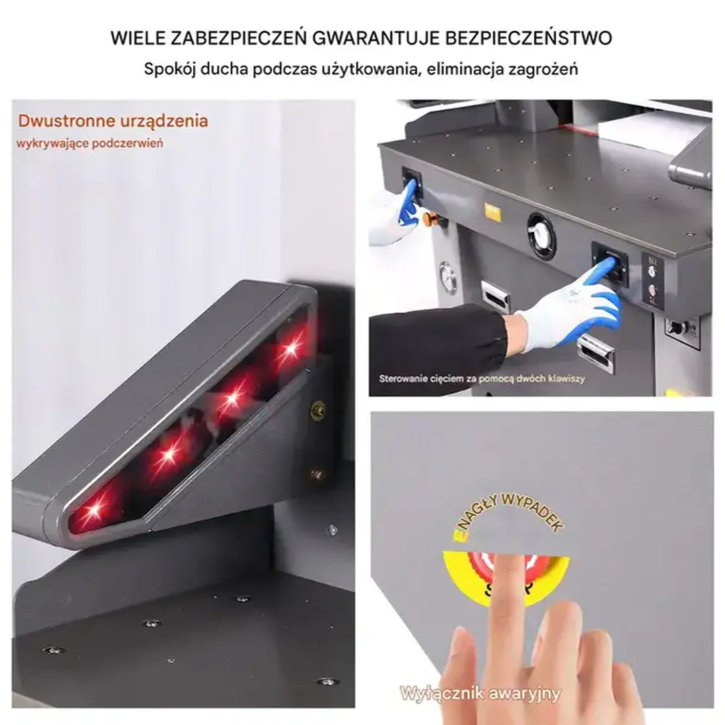 • Bezpieczeństwo użytkowania: Podwójne czujniki podczerwieni, dwuręczna aktywacja przycisków i wyłącznik awaryjny