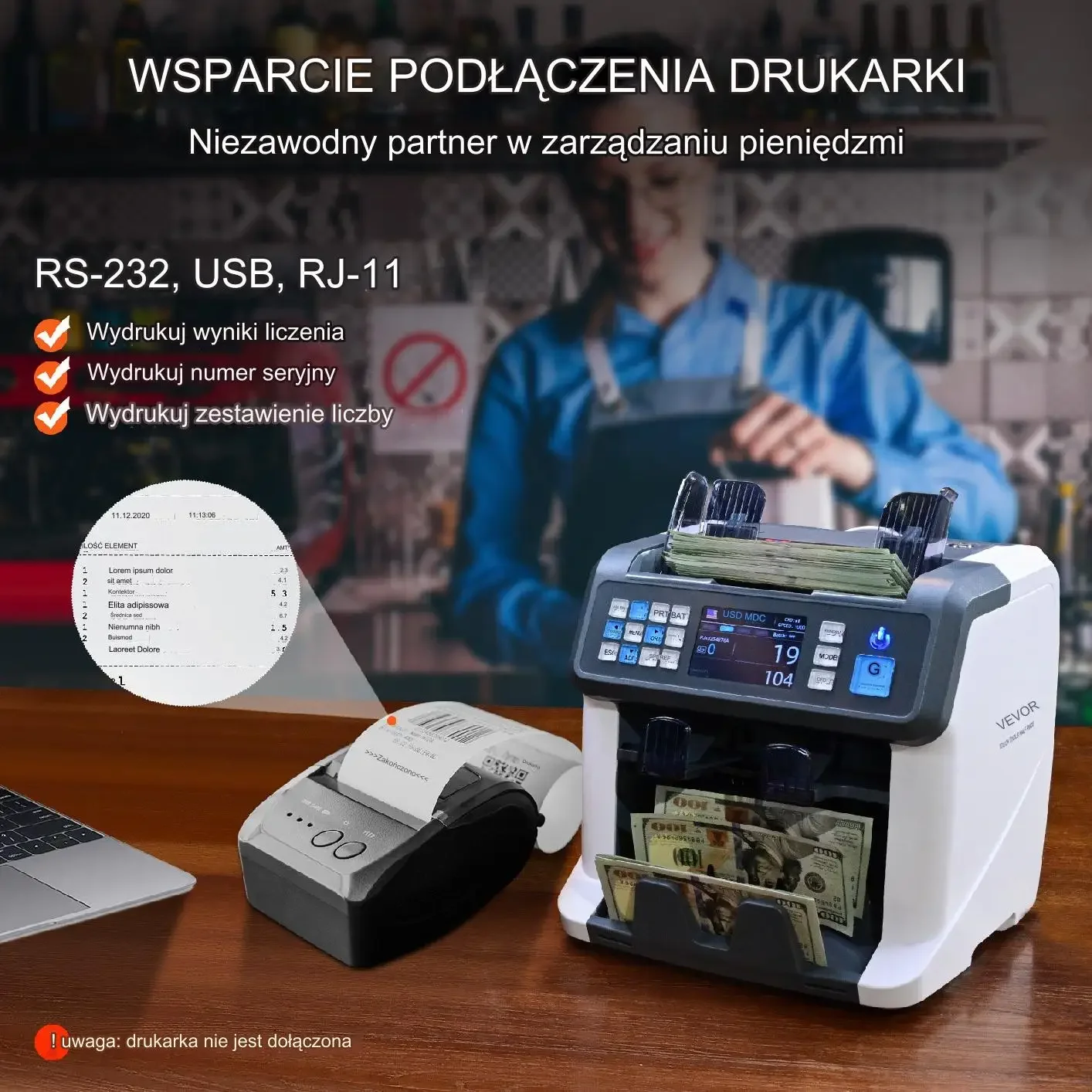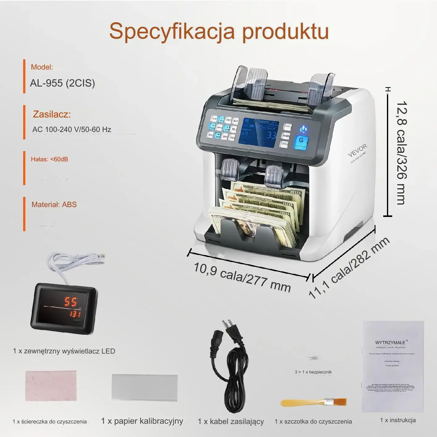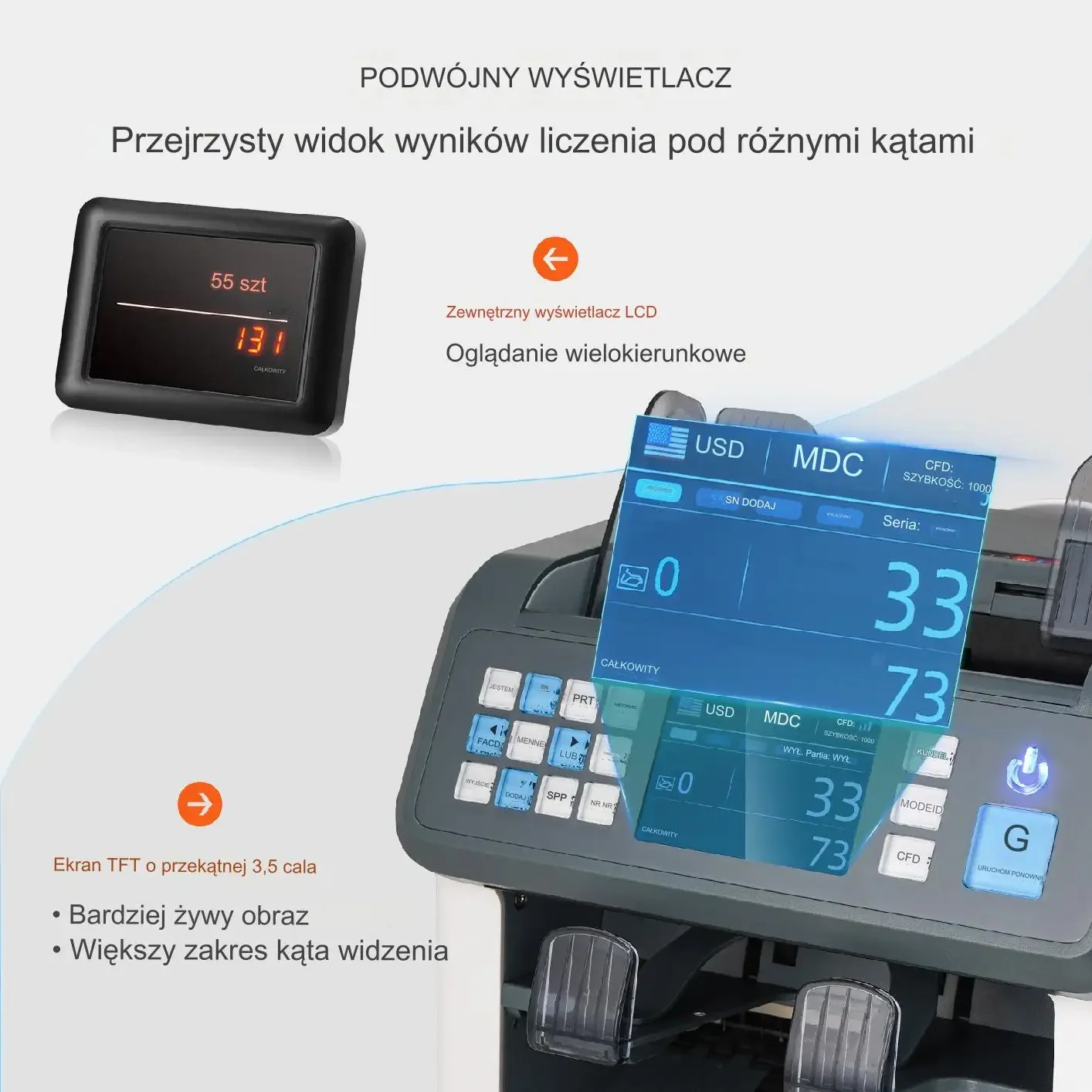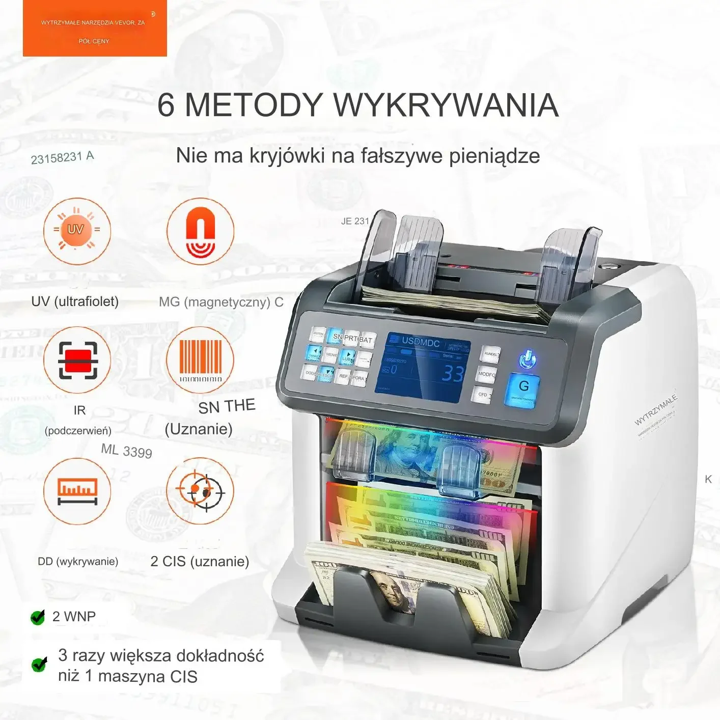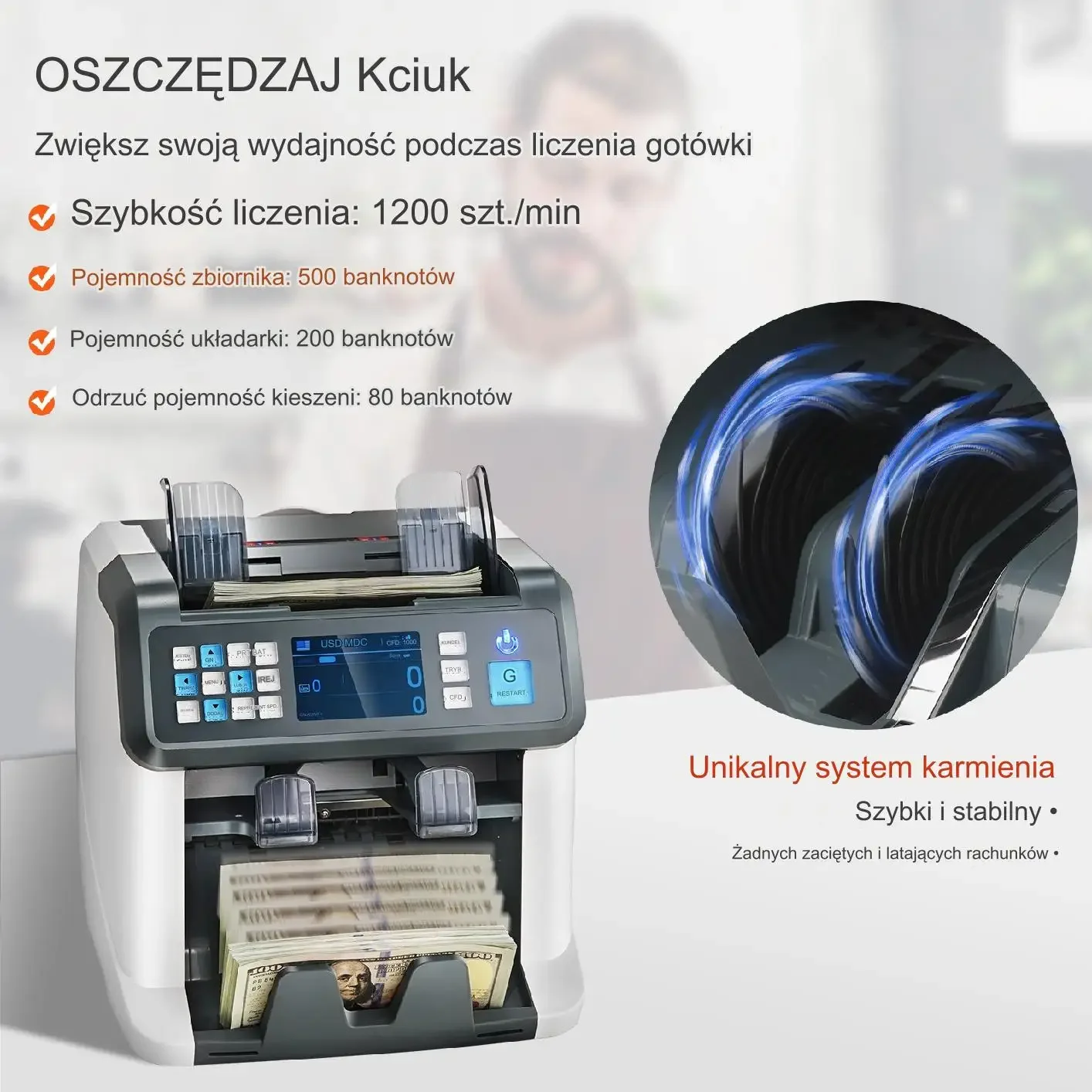 - ✅ Szybkość liczenia: Do 1200 banknotów na minutę (w zależności od trybu).
