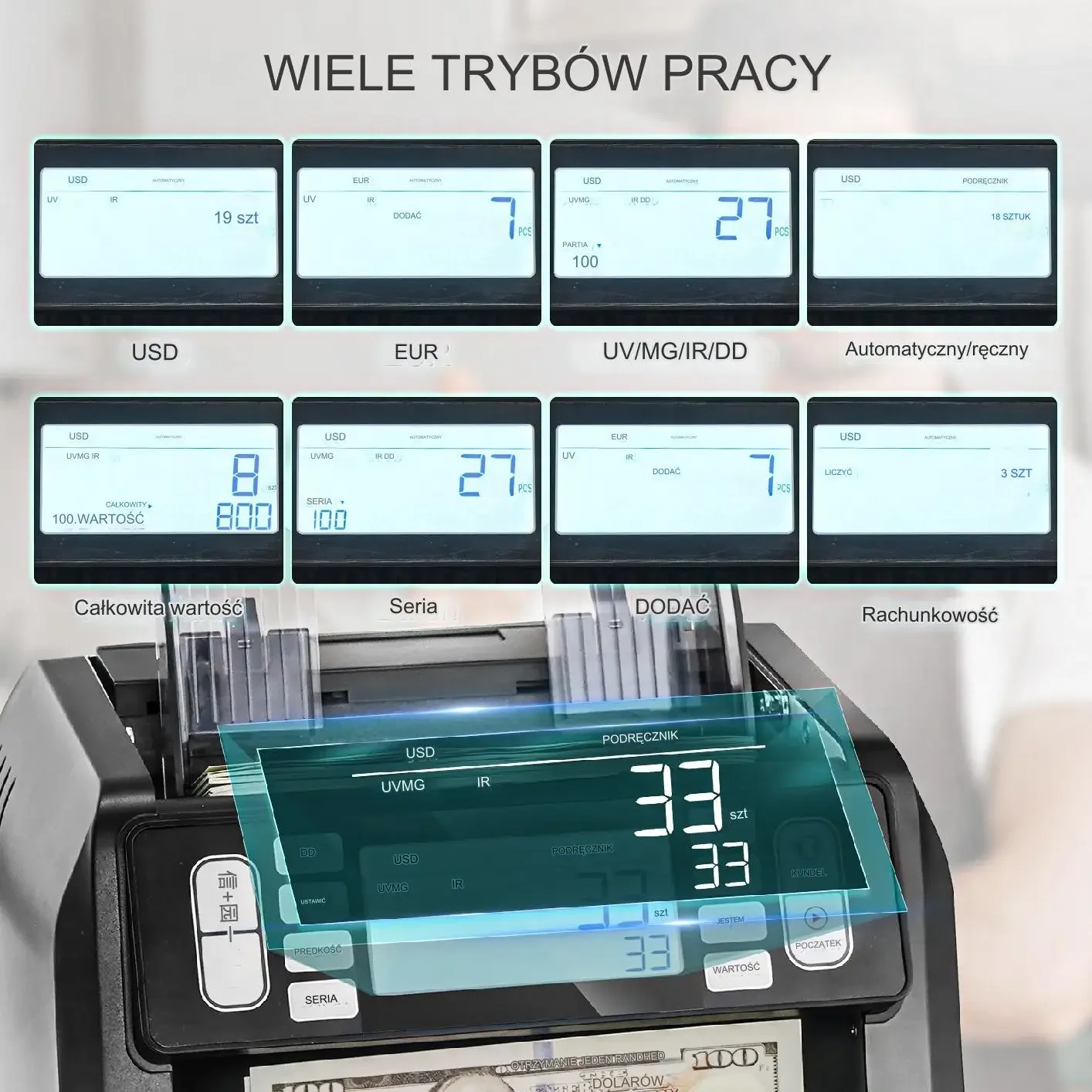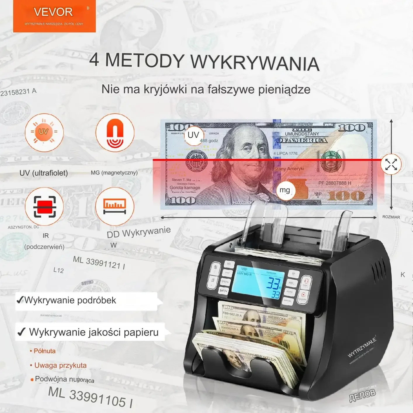 - ✅ Cztery metody wykrywania fałszerstw: UV (ultrafiolet), MG (magnetyzm), IR (podczerwień), DD (podwójna detekcja) – skuteczna ochrona przed fałszywymi banknotami.