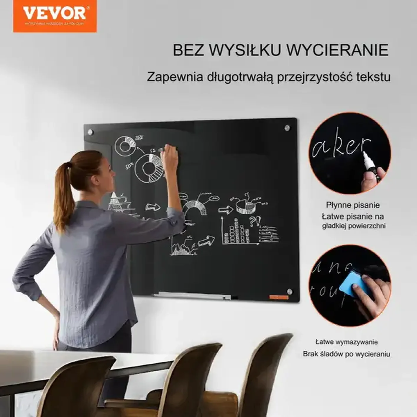 Przekształć swoją przestrzeń dzięki tej wyjątkowej, magnetycznej tablicy szklanej, która łączy minimalistyczny design z niezrównaną funkcjonalnością. Bezramowa konstrukcja i czarna powierzchnia ze szkła hartowanego nadają jej nowoczesny, a zarazem elegancki wygląd, idealnie komponujący się z każdym wnętrzem. Powierzchnia suchościeralna zapewnia płynne pisanie i łatwe usuwanie notatek, bez pozostawiania śladów. Dzięki właściwościom magnetycznym, bez trudu przypniesz ważne dokumenty czy zdjęcia, utrzymując porządek i organizację. Ta tablica to nie tylko praktyczne narzędzie, ale także stylowy element, który podniesie estetykę Twojego biura, domu czy sali konferencyjnej.