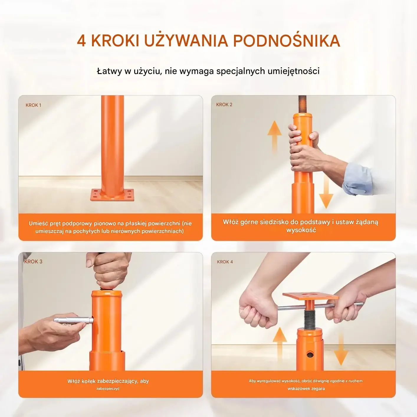 Krok 1: Umieść pręt podporowy pionowo na płaskiej powierzchni (nie umieszczać na pochyłych lub nierównych powierzchniach). Krok 2: Włóż górne siedzisko do podstawy i ustaw żądaną wysokość. Krok 3: Włóż kołek zabezpieczający, aby zabezpieczyć. Krok 4: Aby wyregulować wysokość, obróć dźwignię zgodnie z ruchem wskazówek zegara.