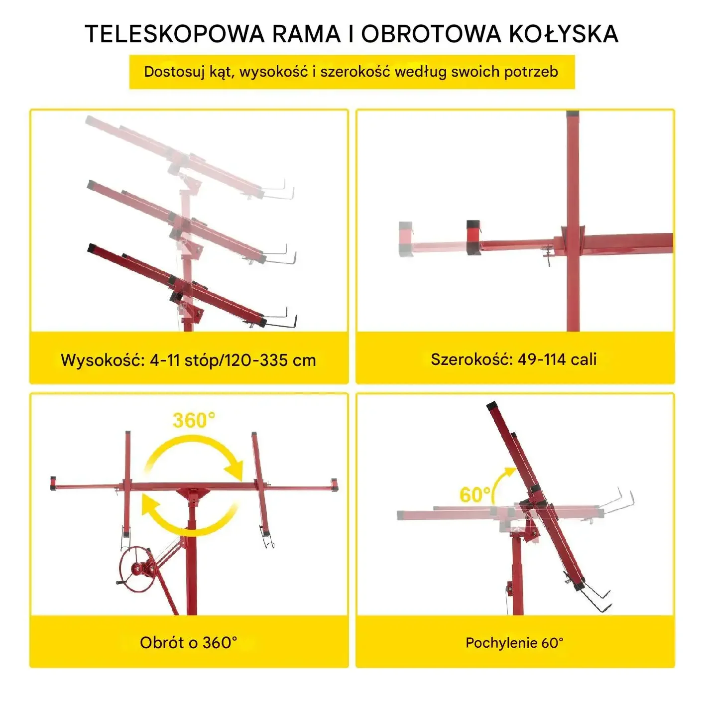 • ✅ Regulowana wysokość ramienia od 1,2 m do 2,9 m – zakres pracy do 4,9 m