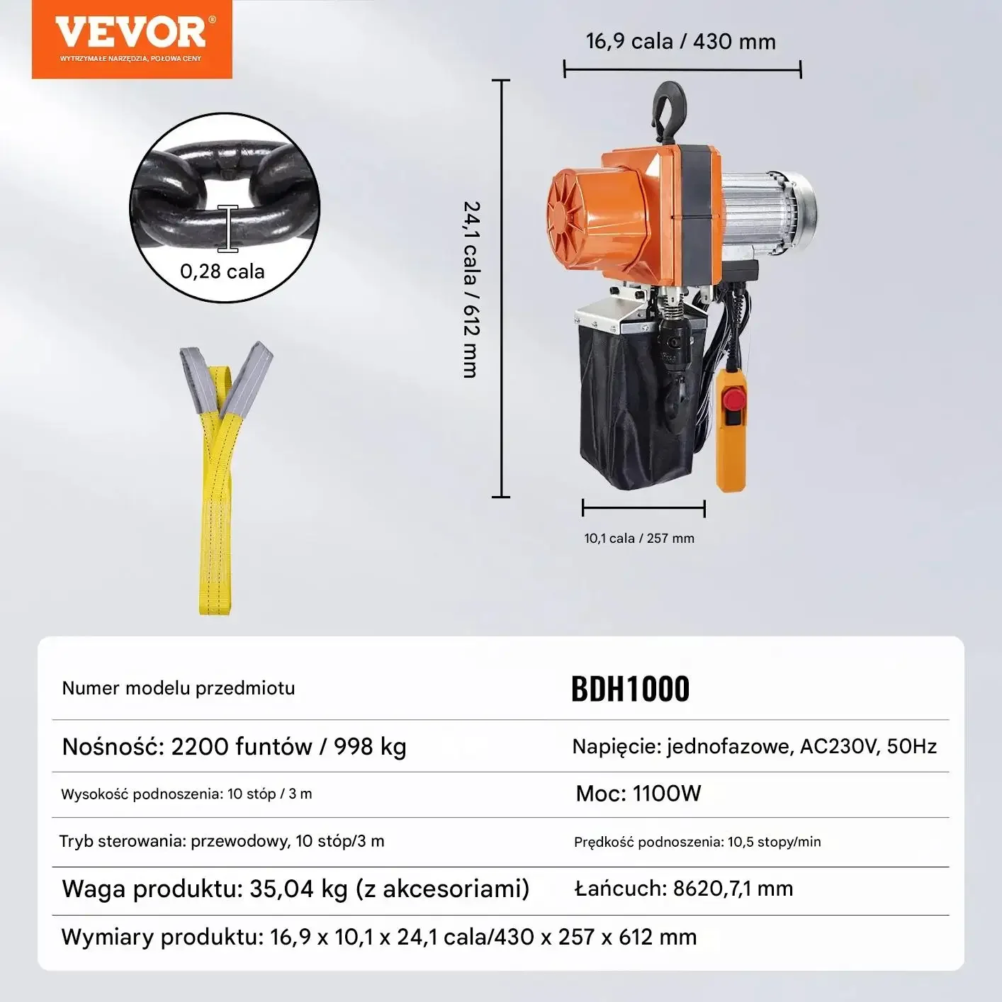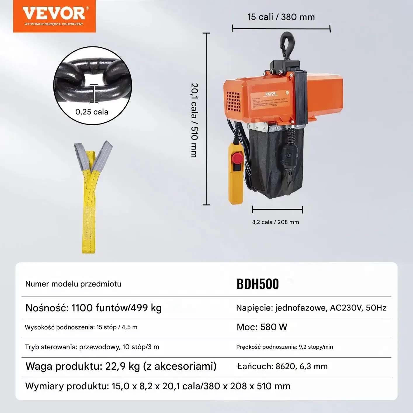 Nośność wynosi 499 kg. Napięcie to jednofazowe, AC230V, 50Hz. Moc wynosi 580 W. Wysokość podnoszenia to 4,5 metra. Tryb sterowania jest przewodowy, 3 metry. Prędkość podnoszenia wynosi 2,8 metra na minutę. Łańcuch ma wymiary 8620, 6,3 mm. Waga produktu z akcesoriami to 22,9 kg. Wymiary produktu to 380 x 208 x 510 mm.
