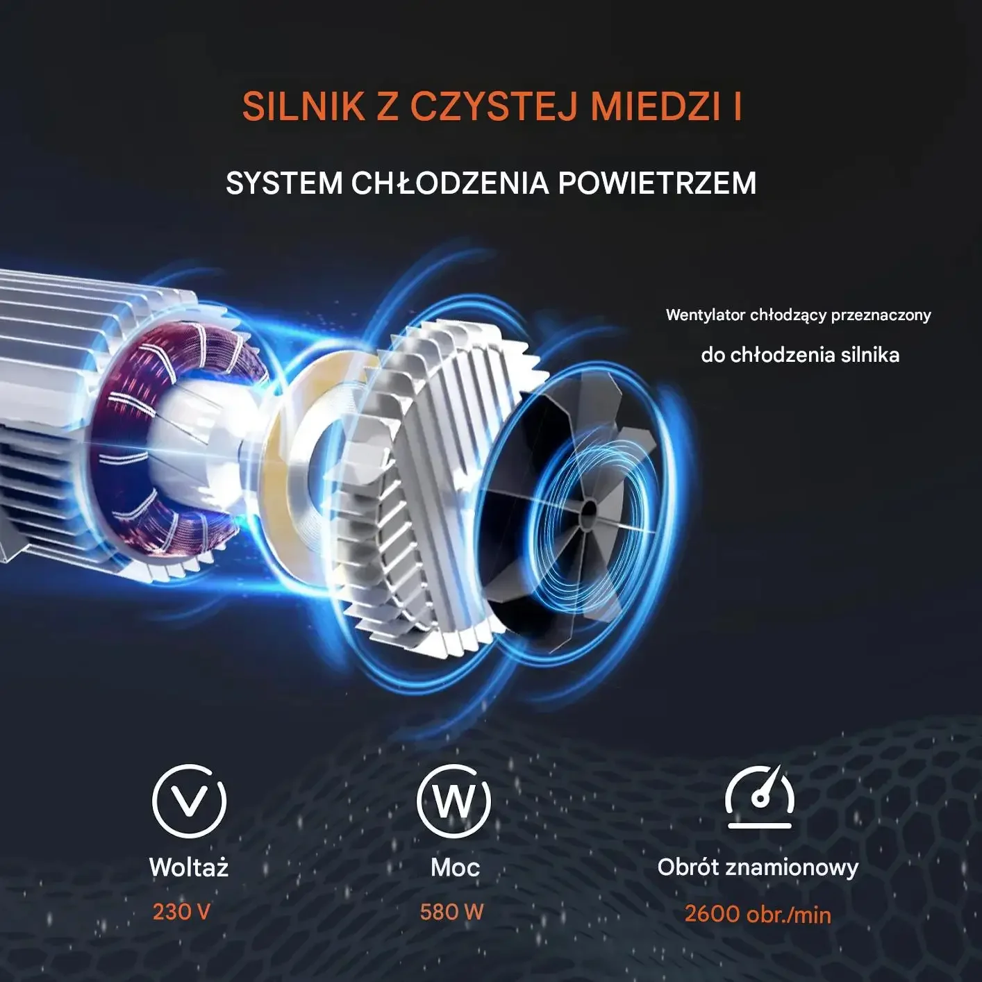 - ✅ Mocny silnik miedziany: Silnik o mocy 580W gwarantuje niezawodną pracę i dużą siłę.