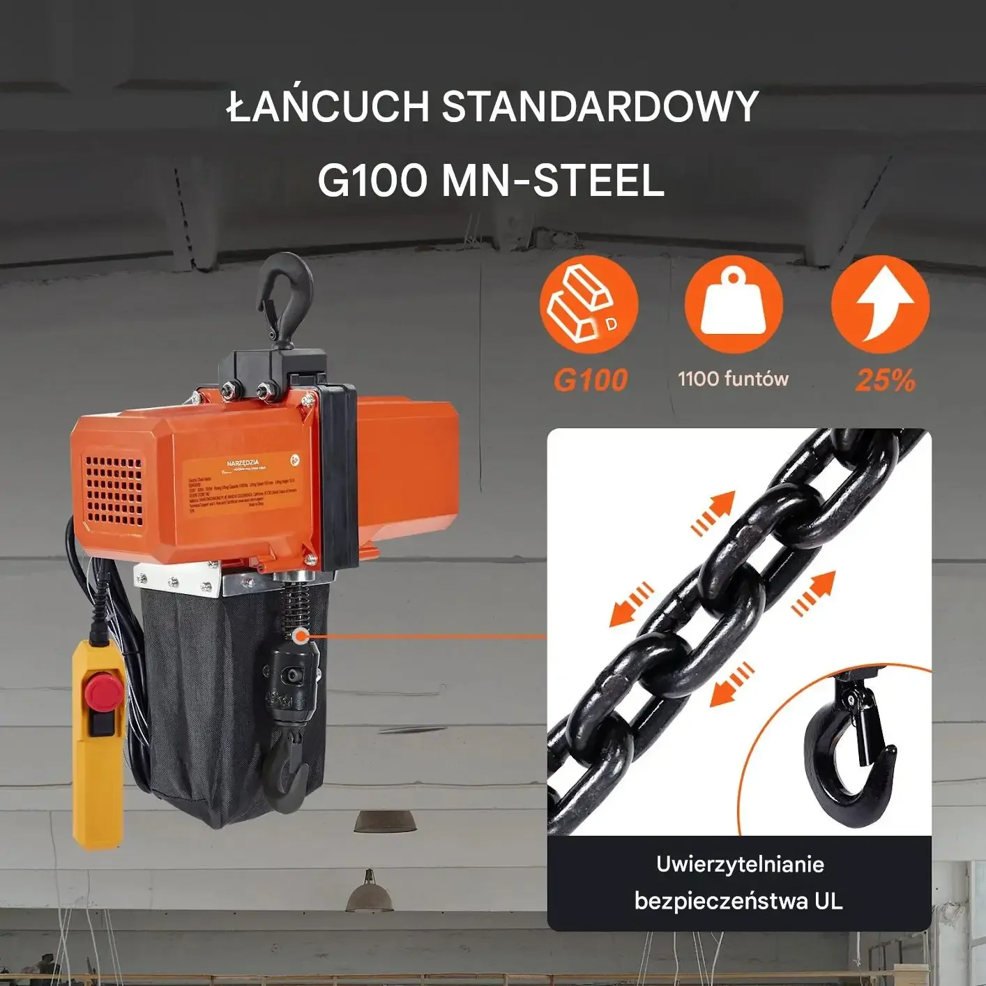 Wciągnik wyposażony jest w silnik z czystej miedzi oraz system chłodzenia powietrzem z wentylatorem przeznaczonym do chłodzenia silnika. Standardowy łańcuch G100 MN-STEEL o udźwigu 499 kg zapewnia bezpieczeństwo i jest uwierzytelniony przez UL.
