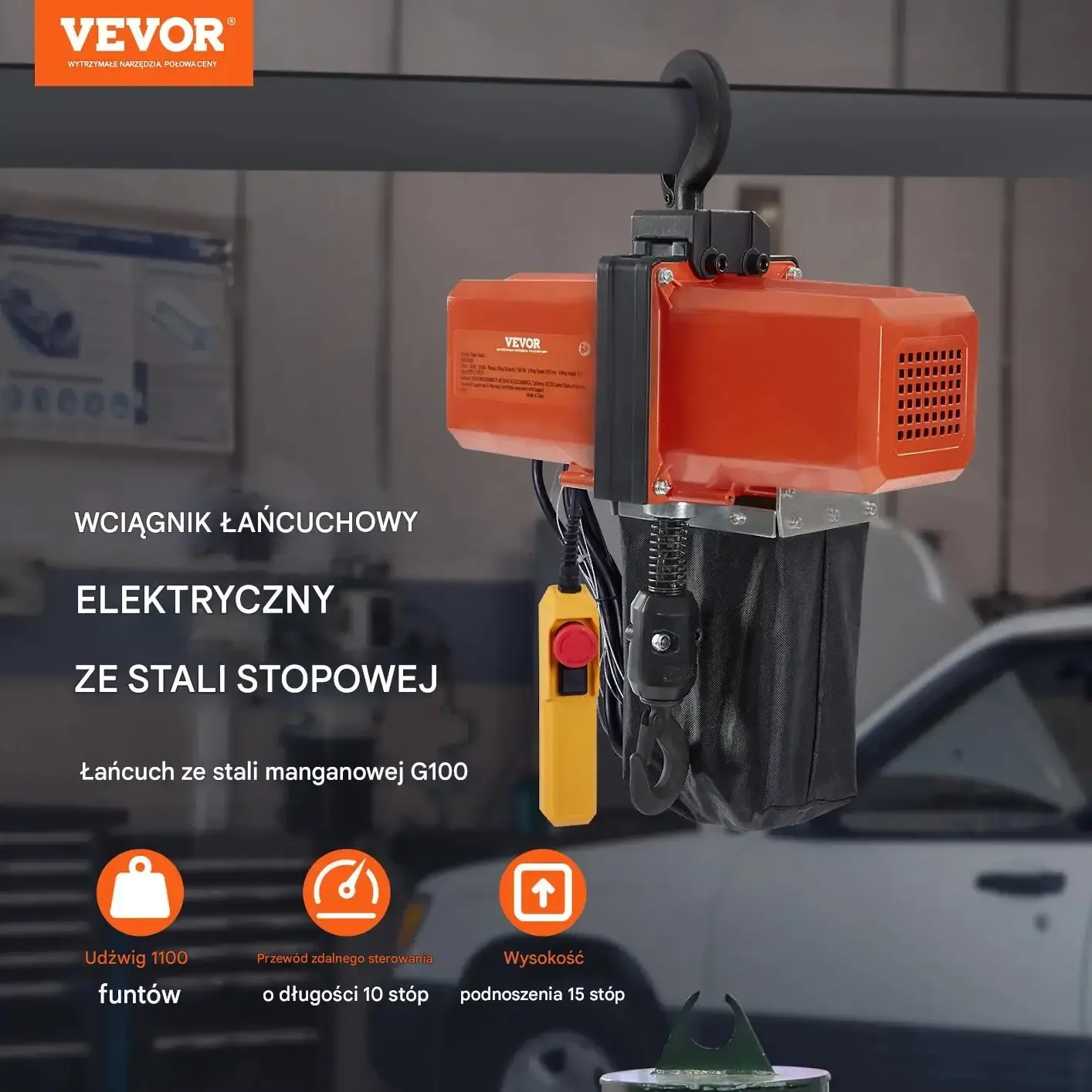 Elektryczny wciągnik łańcuchowy ze stali stopowej wyposażony jest w łańcuch ze stali manganowej G100. Posiada udźwig 499 kg, przewód zdalnego sterowania o długości 3 metrów oraz wysokość podnoszenia 4,5 metra.