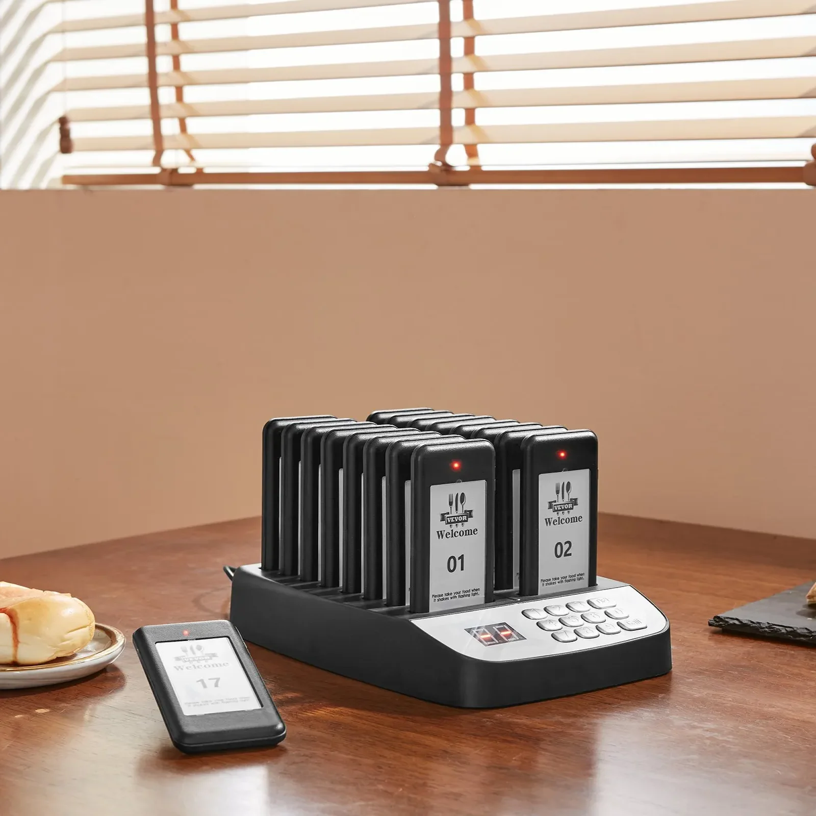 - W zestawie znajdziesz nadajnik bezprzewodowy wyposażony w 998 kanałów i dotykową klawiaturę, wraz z 16 pagerami umożliwiającymi oczekiwanie na obsługę bez konieczności tworzenia fizycznych kolejek.