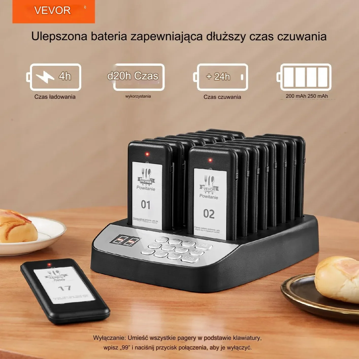 - Zaawansowany system przywoławczych pagerów restauracyjnych, doskonałe rozwiązanie do efektywnego zarządzania przepływem klientów.
