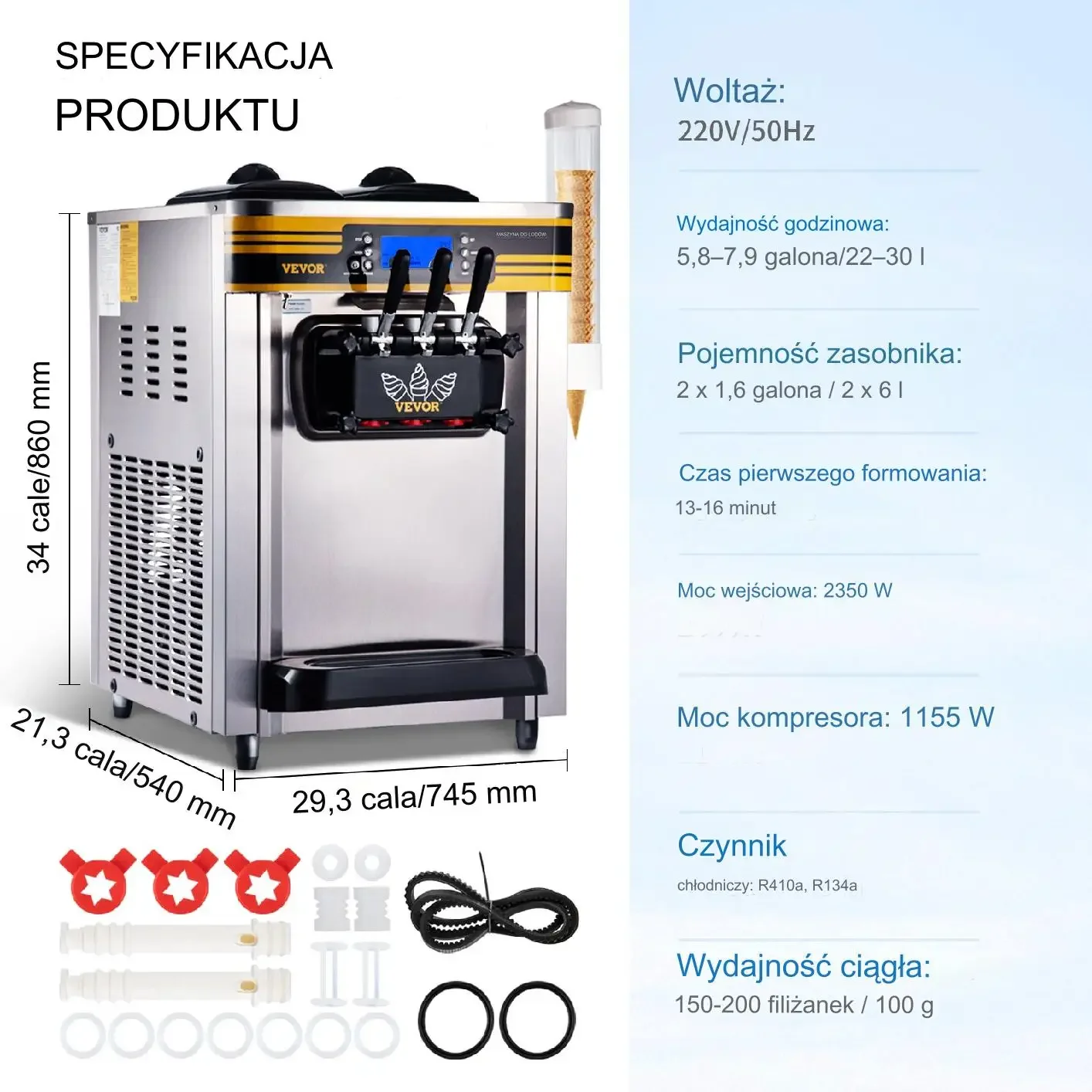 Wymiary całkowite urządzenia: 540 mm wysokości oraz 563 mm szerokości. Pojemność wiadra: 4 L. Moc: 700 W. Czas produkcji lodu 24 h: 230 kg. Bieg bezstopniowa regulacja prędkości. Prędkość chłodzenia: 40 s. Szerokość mieszalnika i inne parametry dotyczące konstrukcji podane w specyfikacji produktu.