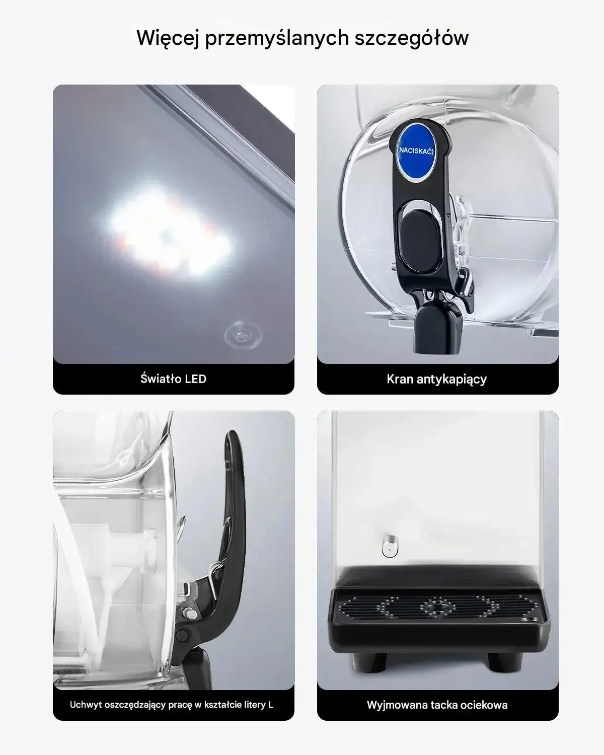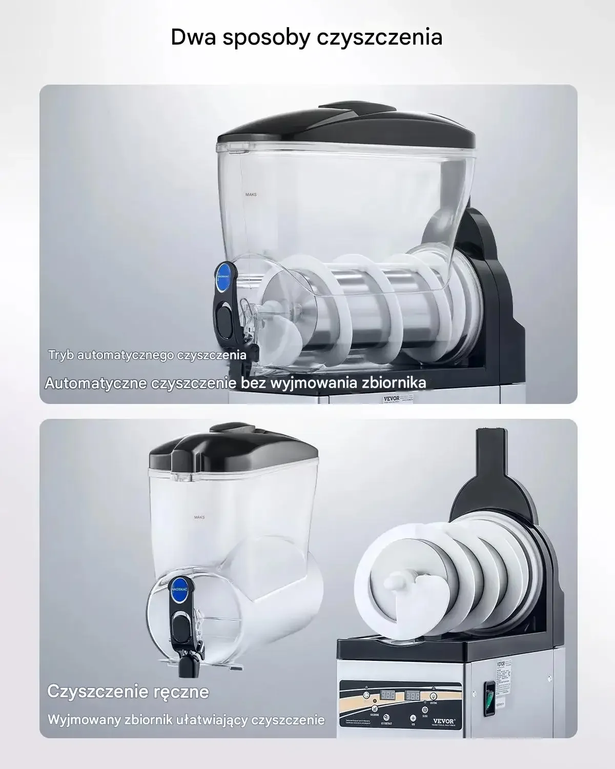 - ➡️ Oszałamiająca prezentacja: Przezroczysty zbiornik zachwyca kolorowymi napojami, przyciągając klientów.