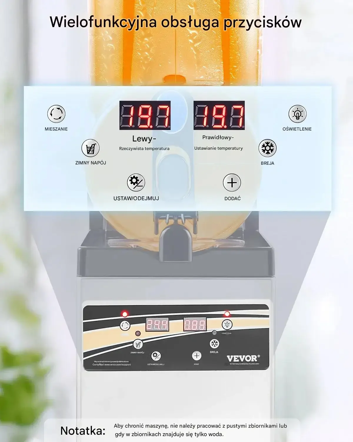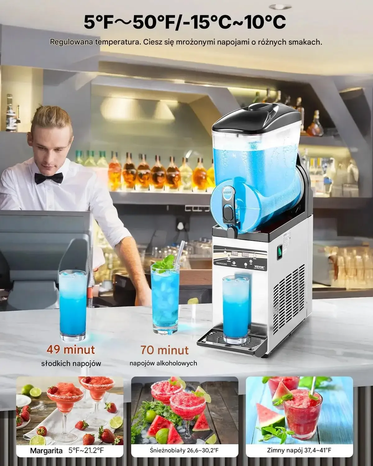 - ✅ Łatwa obsługa: Przyjazny dla użytkownika panel sterowania z dwoma trybami (slushy i napój zimny), kontrolą temperatury i automatycznym czyszczeniem.