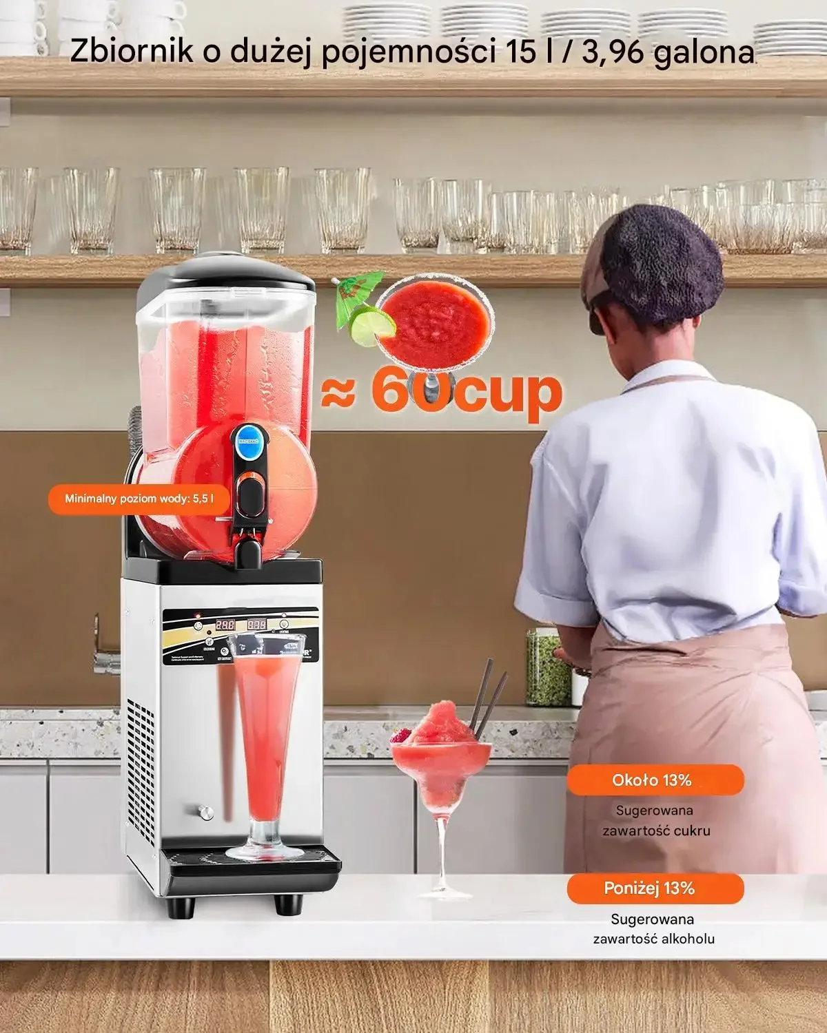 - ✅ Pojemność 15L: Możliwość przygotowania około 60 kubków slushów na jedną partię, idealna do miejsc o dużym ruchu.